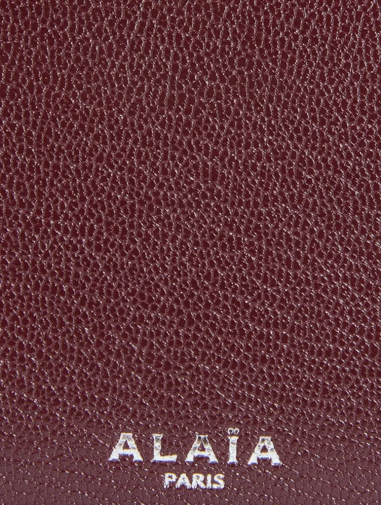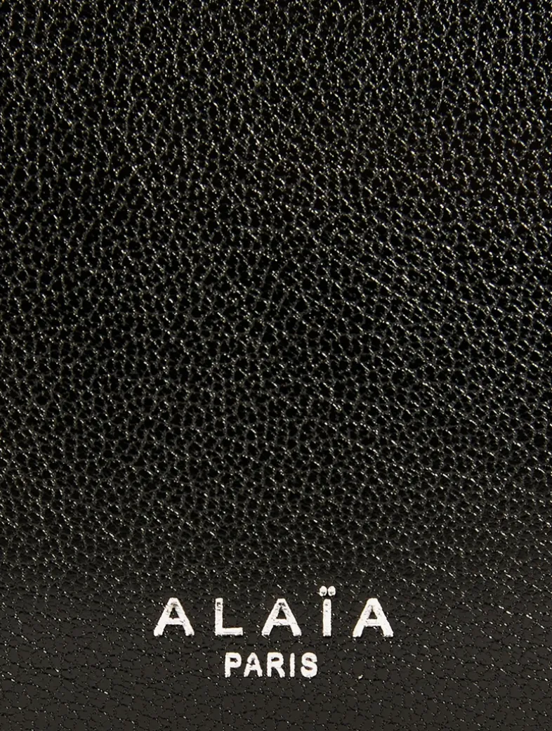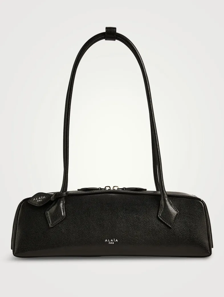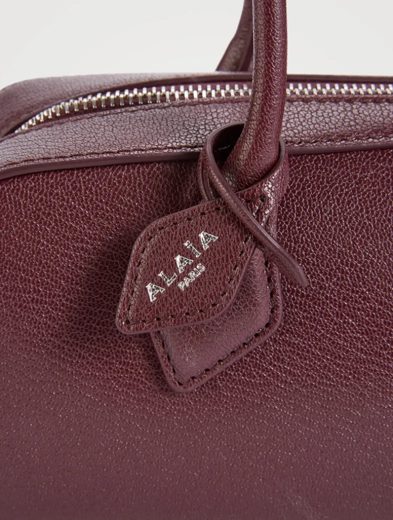 Designed with an elongated shape, this leather bag is topped with a set of tubular handles with two decorative ties. It has a double zip fastening and a small removable mirror in the inside pocket.