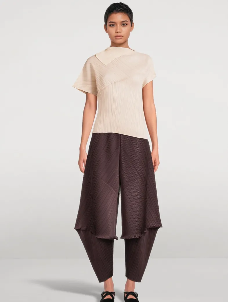 Leap features unique, geometric shapes inspired by a silhouette fiercely leaping upward. The diagonal pleating in opposing directions is created by folding the garments before they undergo the pleating process. This pleated top features a fold-over neckline, and asymmetrical cap sleeves and hemline.