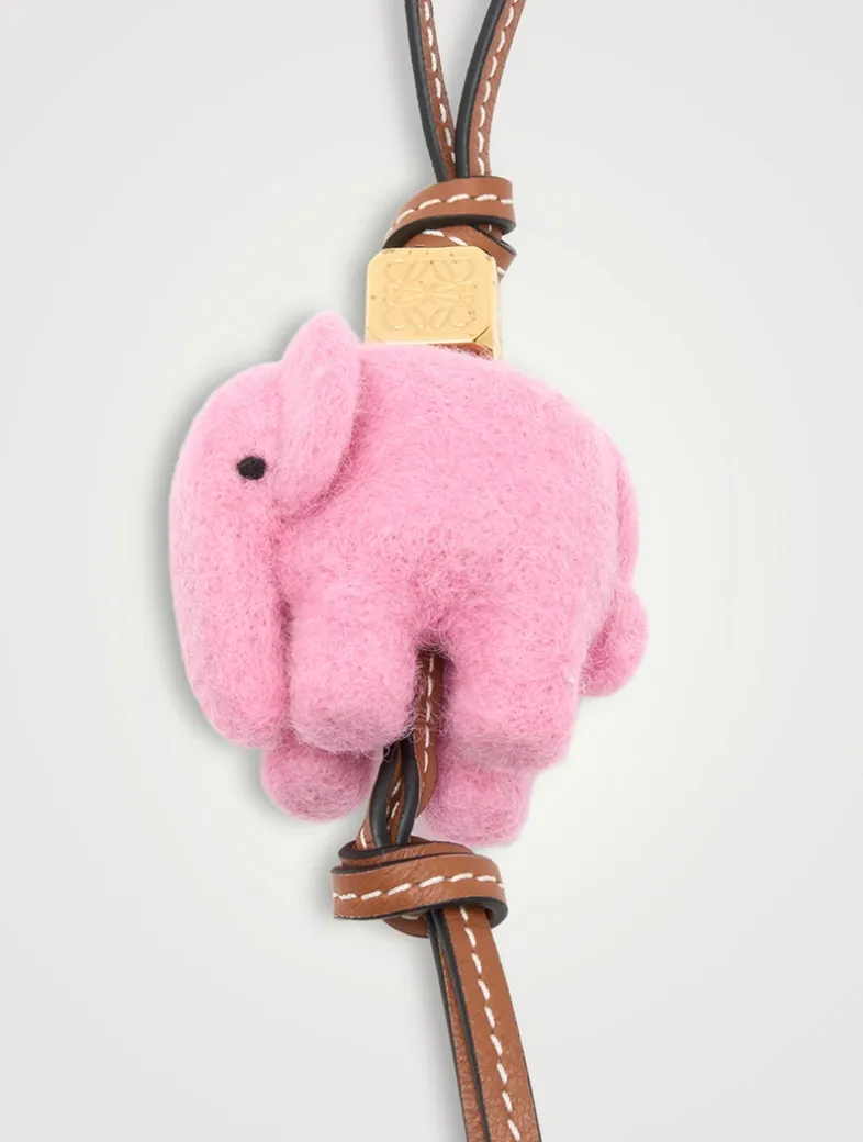 This playful felt elephant charm is felted with a looped calfskin leather strap, and signature goldtone Anagram dice.