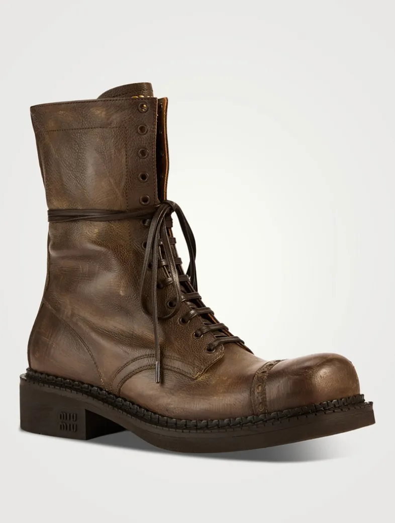 These sleek leather boots that nod to menswear-inspired styles are characterized by the perforated motif on the upper, the laces wrapped around the boot, and the Miu Miu logo on the tongue.