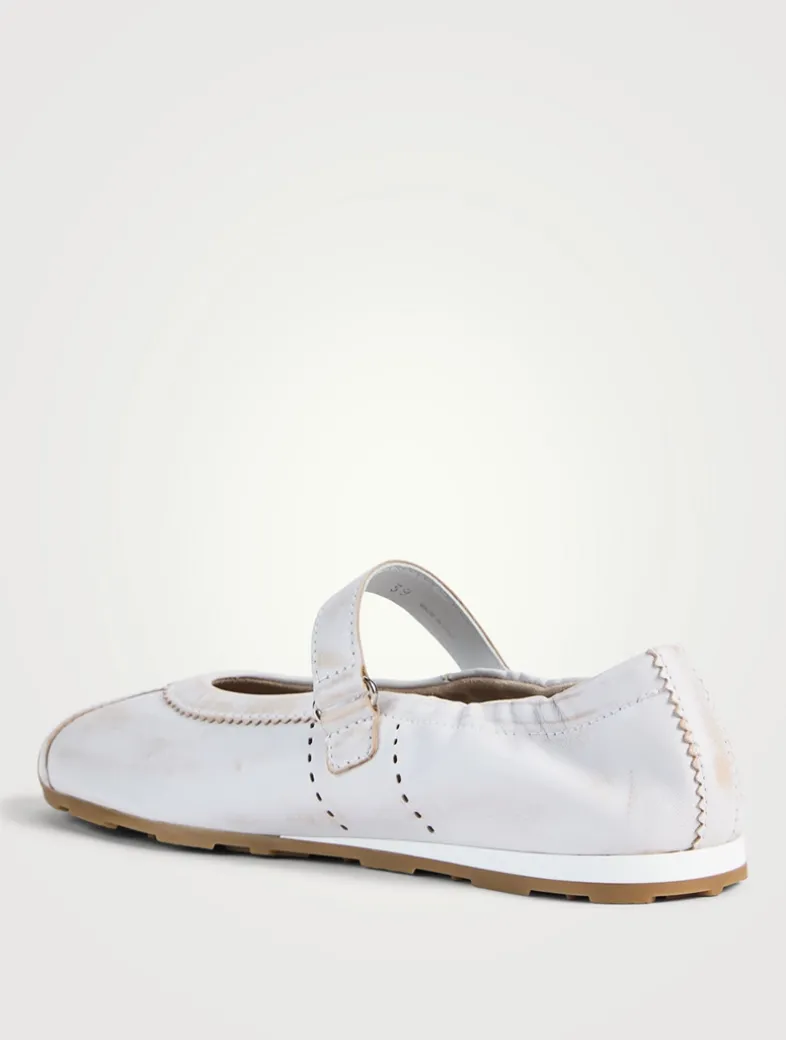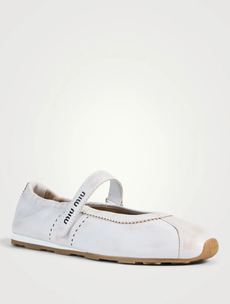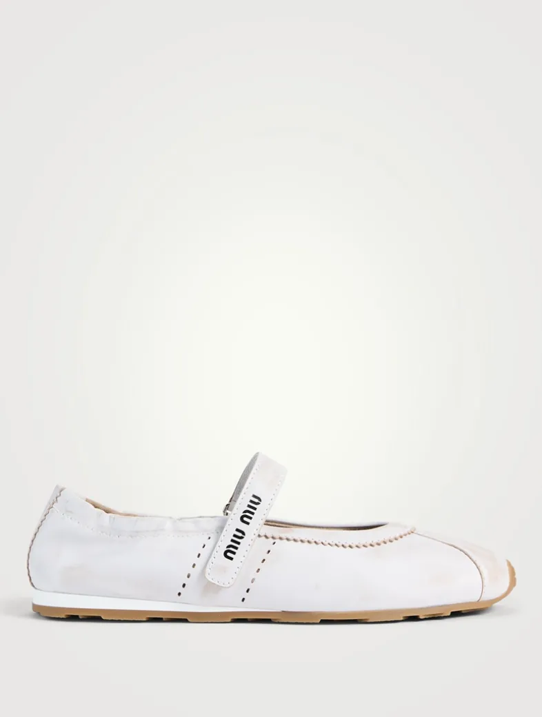 The emblematic style of the Miu Miu ballerina is reinterpreted in this bleached nappa leather version that enhances particular details and the versatility of its silhouette. Featuring a removable leather-covered insole and a screen-printed logo on the strap and insole.