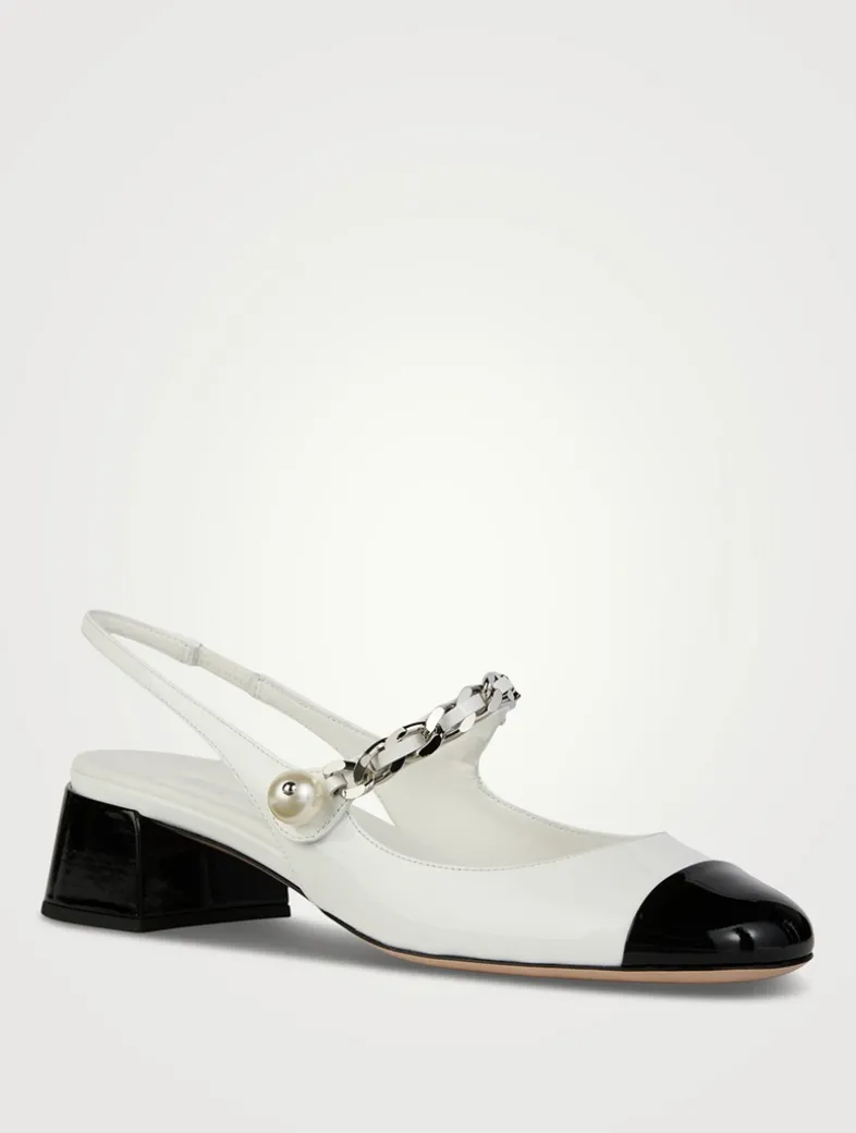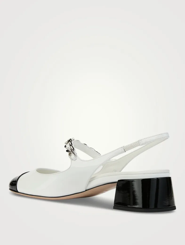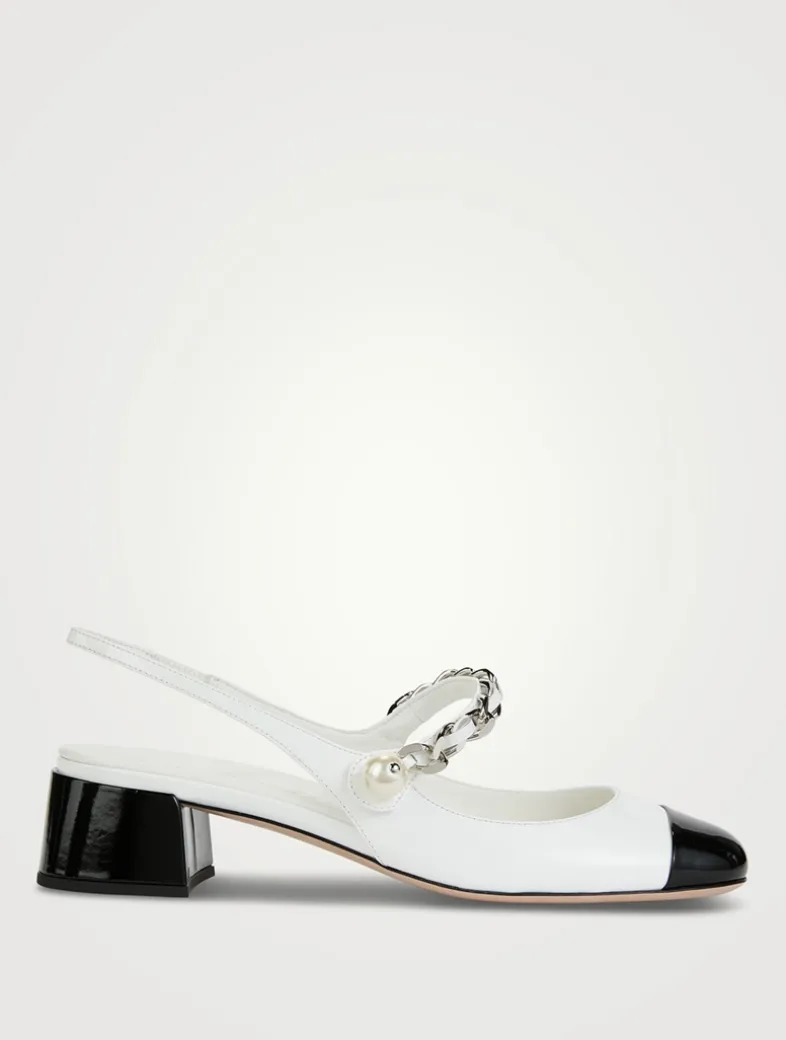 Playing with the iconic two-tone design and classic taste, Miu Miu presents a new version of the pump with a sophisticated yet provocative character. The captivating metal chain is combined with the pearl, which evokes traditional style, while the structured heel and slingback style recall a retro world. Thanks to its design, the shoe enters the woman’s feminine wardrobe, subverting conventional rules of style.
