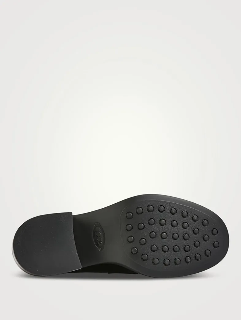 These loafers, crafted in calfskin leather, are designed with a penny bar and embossed Tod’s logo on the side. Featuring a rubber outsole with embossed rubber pebbles, they are a contemporary hybrid perfect from the office to the weekend.