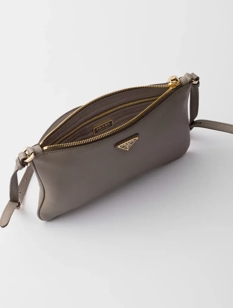 Zipper closure–Enameled metal triangle logo–Adjustable leather handle–Logo-print nylon lining with zipper pocket