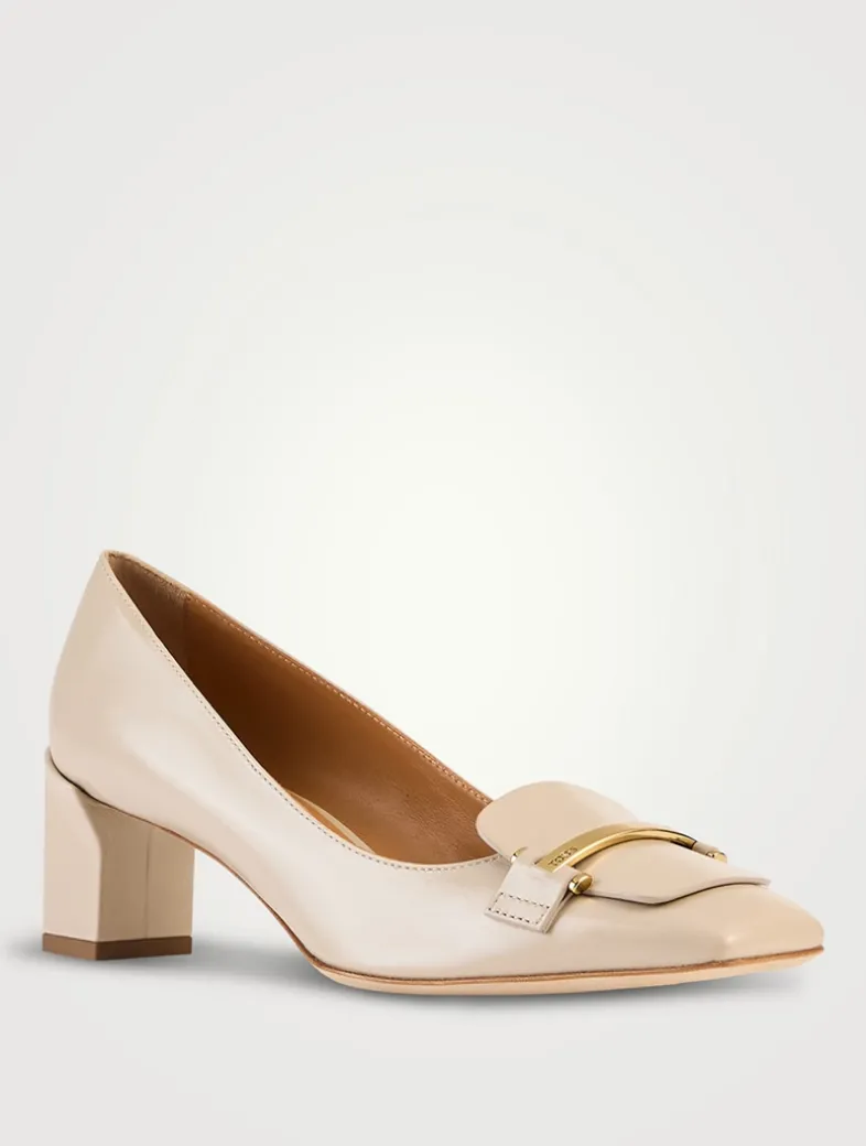 Set on a geometric heel, these square-toe pumps are crafted in precious calfskin leather with a branded metal bar secured across the top of the foot.