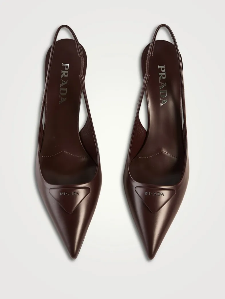 The pointy slingback style is defined by the geometric heel and the leather triangle logo slightly padded for a three-dimensional effect that completes the feminine shoe with modernist allure.