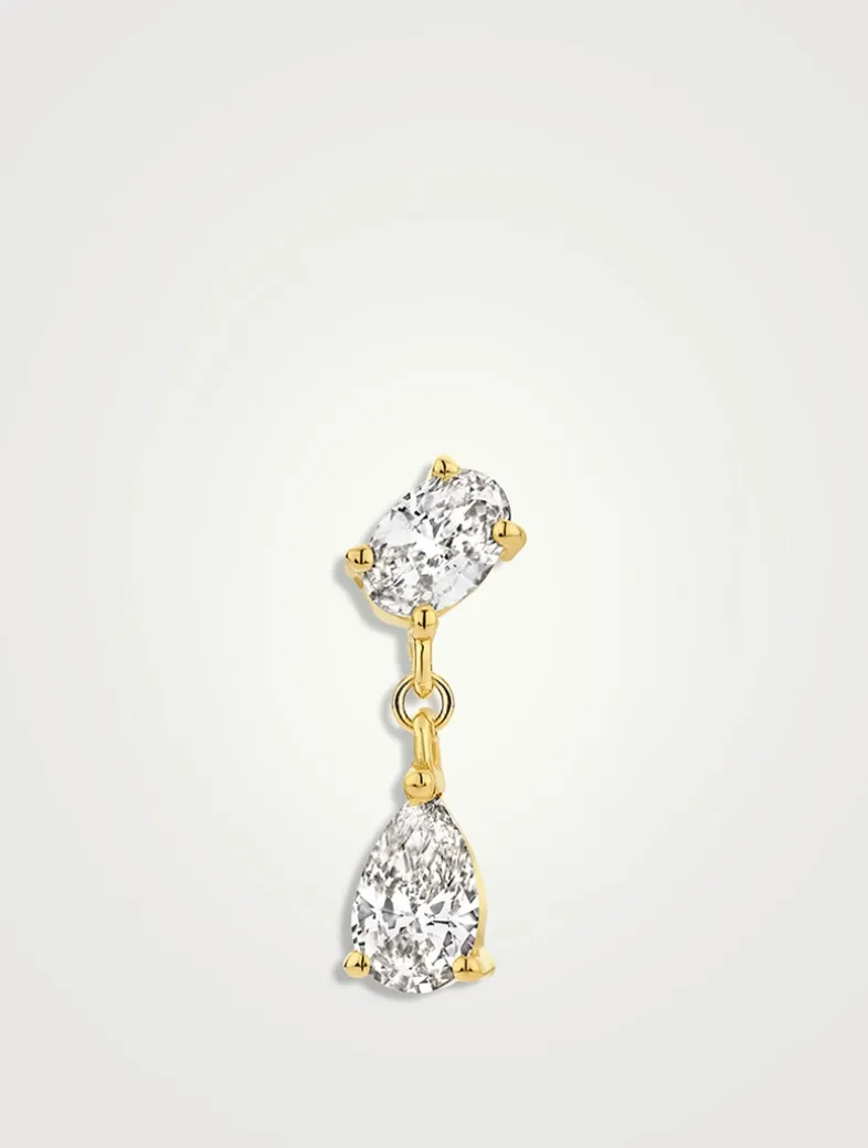 The Nemo earring features a stunning combination of a pear-shaped drop diamond paired with an oval-shaped stone. Crafted from 18k recycled gold, it showcases two brilliant diamonds that add shine and movement to any look. Similar to the Gala earring, the Nemo earring pairs the elegance of a pear and oval shape, creating a striking design that gracefully dangles for a sophisticated finish.