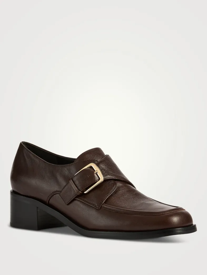 Seamlessly blending feminine and masculine elements, this leather monk-strap loafer is set on a stacked block heel and finished with a modern squared apron toe.