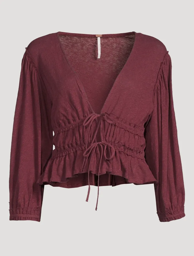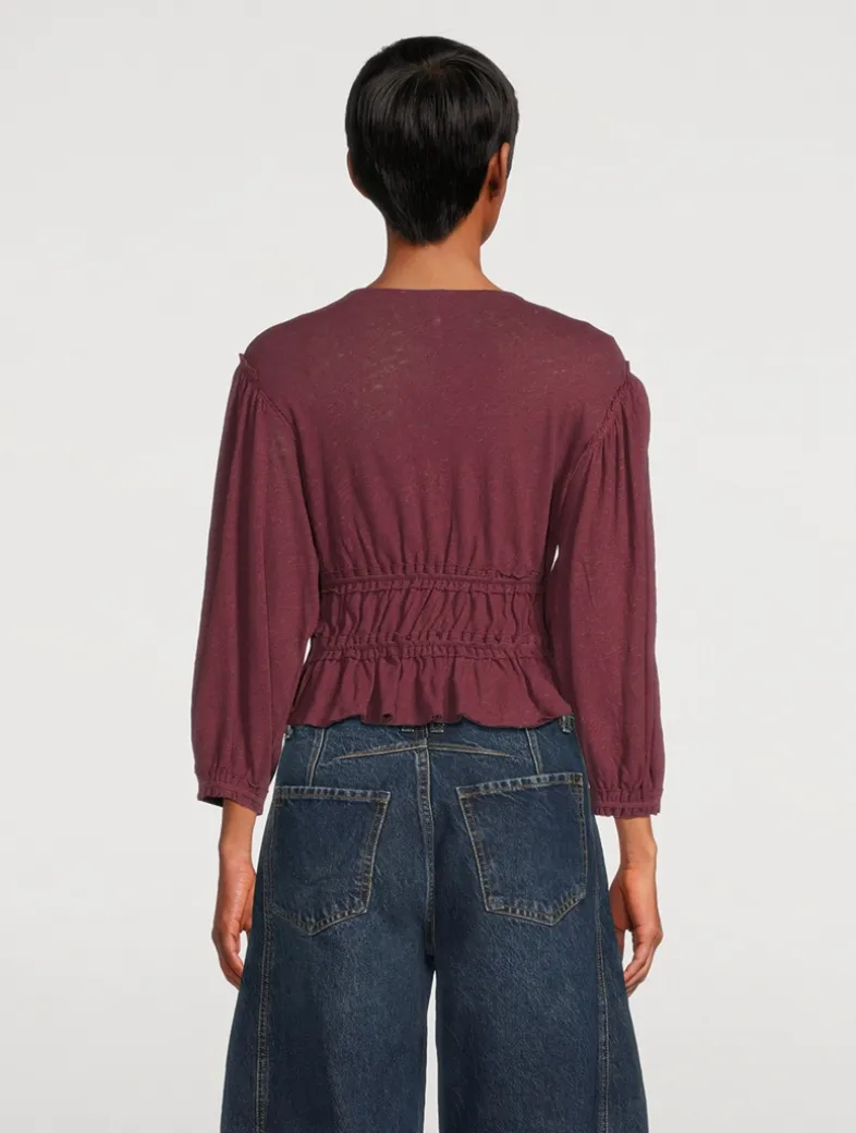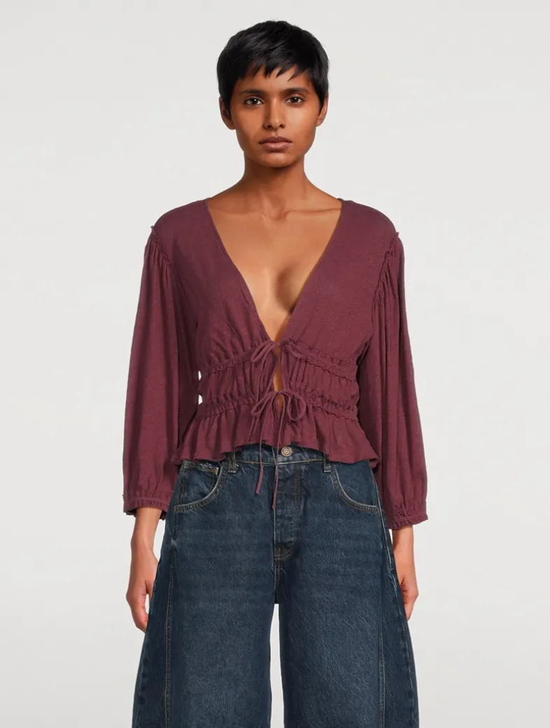 So breezy and beachy, this staple blouse is featured in a cotton-linen fabrication with a V-neckline, shirred bodice, and tie-front details. It has breezy bracelet-length sleeves with cinched cuffs and a subtle peplum hem.
