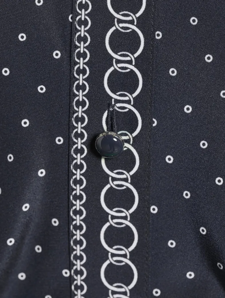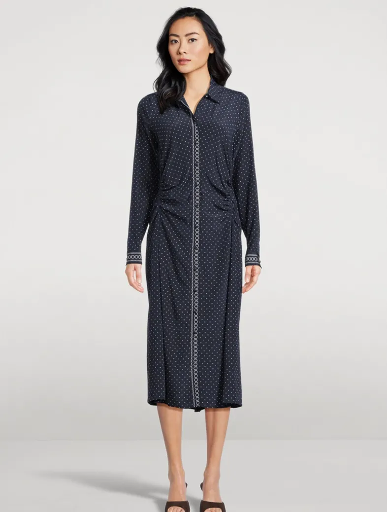 Expertly tailored from premium stretch silk, the Lex dress is an elegant take on the wardrobe classic. The midi style features ruching on the sides, a beautiful drape, and a decorative trim of trompe l’oeil chain-links against polka dots.