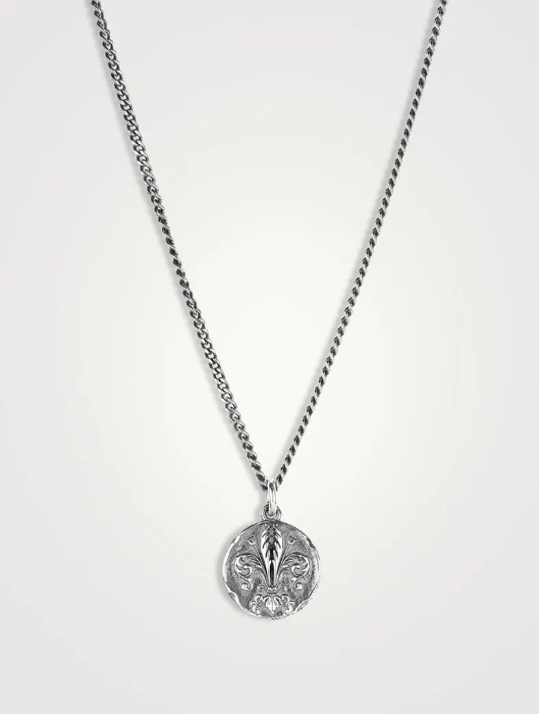 Crafted in Italy, this sterling silver grumetta chain necklace with lily-engraved coin pendant at drop