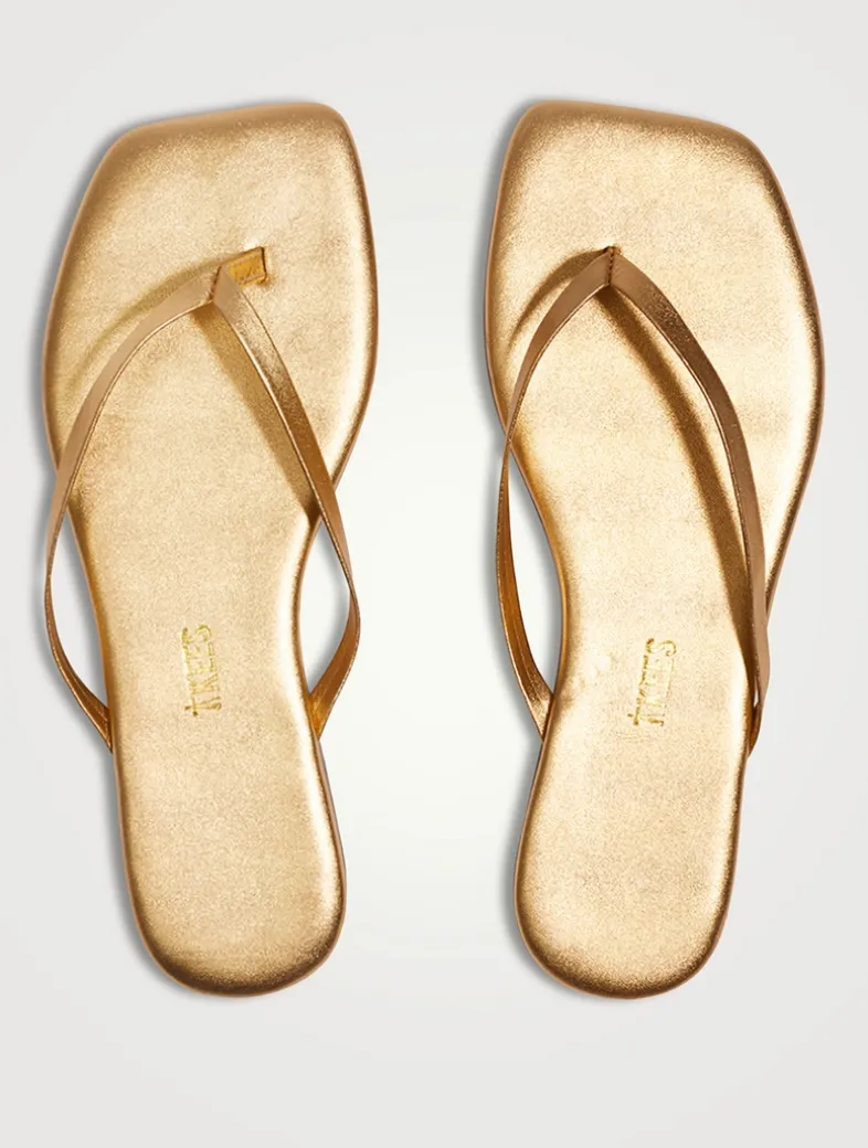 A squared-off toe defines these thong sandals, which are crafted from metallic leather with a rubber sole.