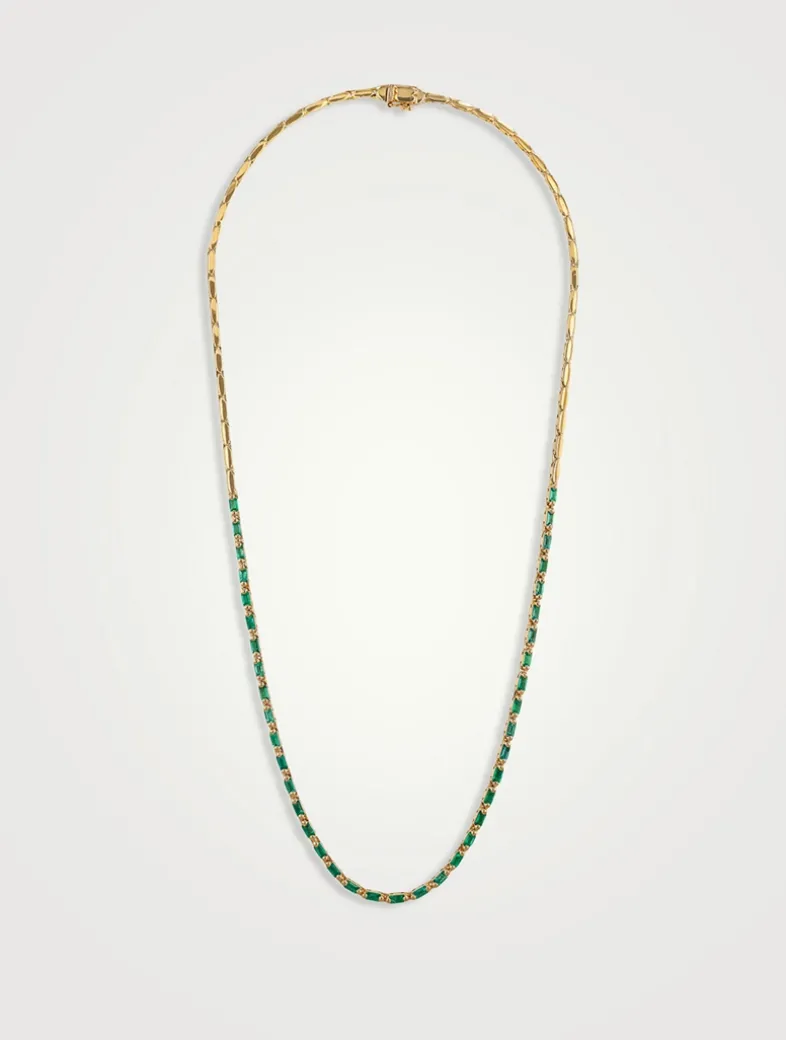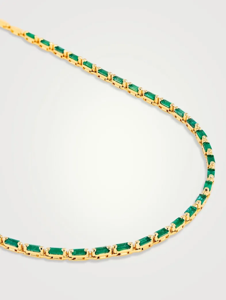 Handcrafted with 18-karat gold, this emerald necklace is Suzanne Kalan’s modern interpretation of the classic tennis necklace. Flexible and fluid, it is lined up with glowing emeralds.