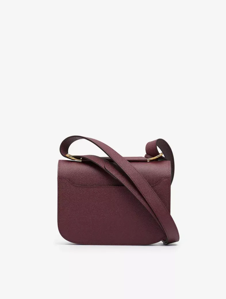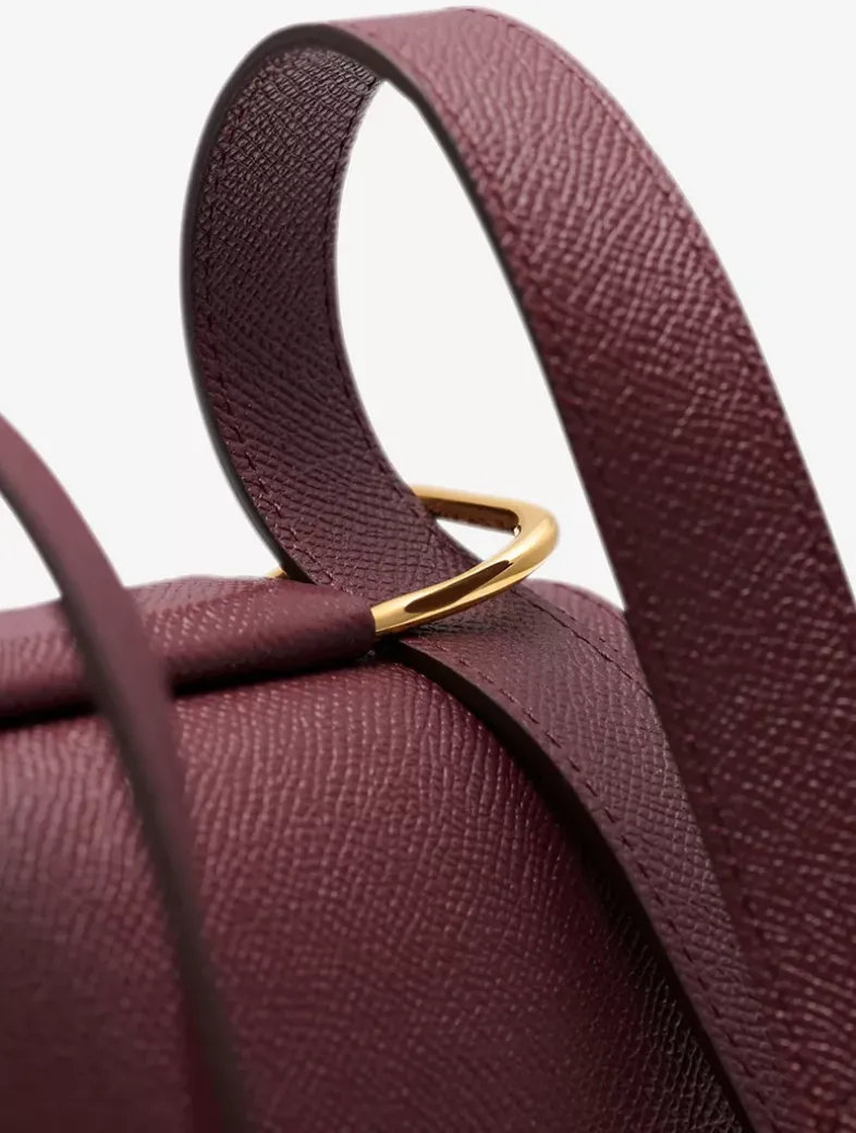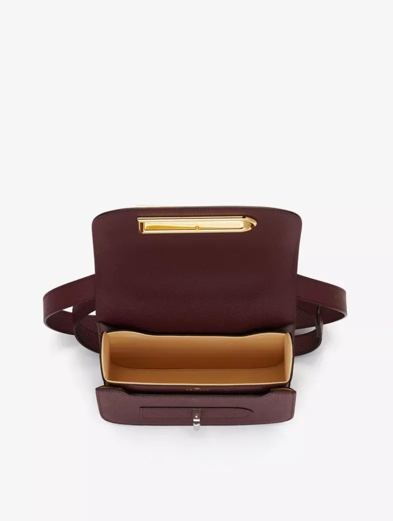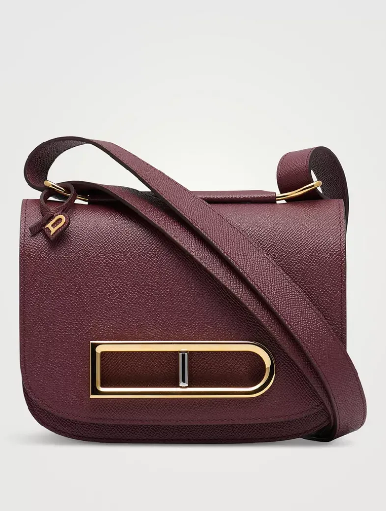Structured crossbody bag in Alpina Calf leather with signature oversized D-shaped buckle in two-toned metal hardware. Crafted in Rosewood, a rich bordeaux. Features an adjustable shoulder strap.