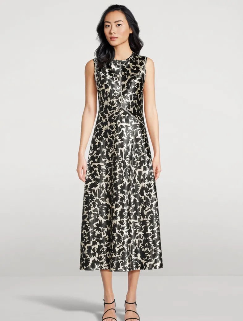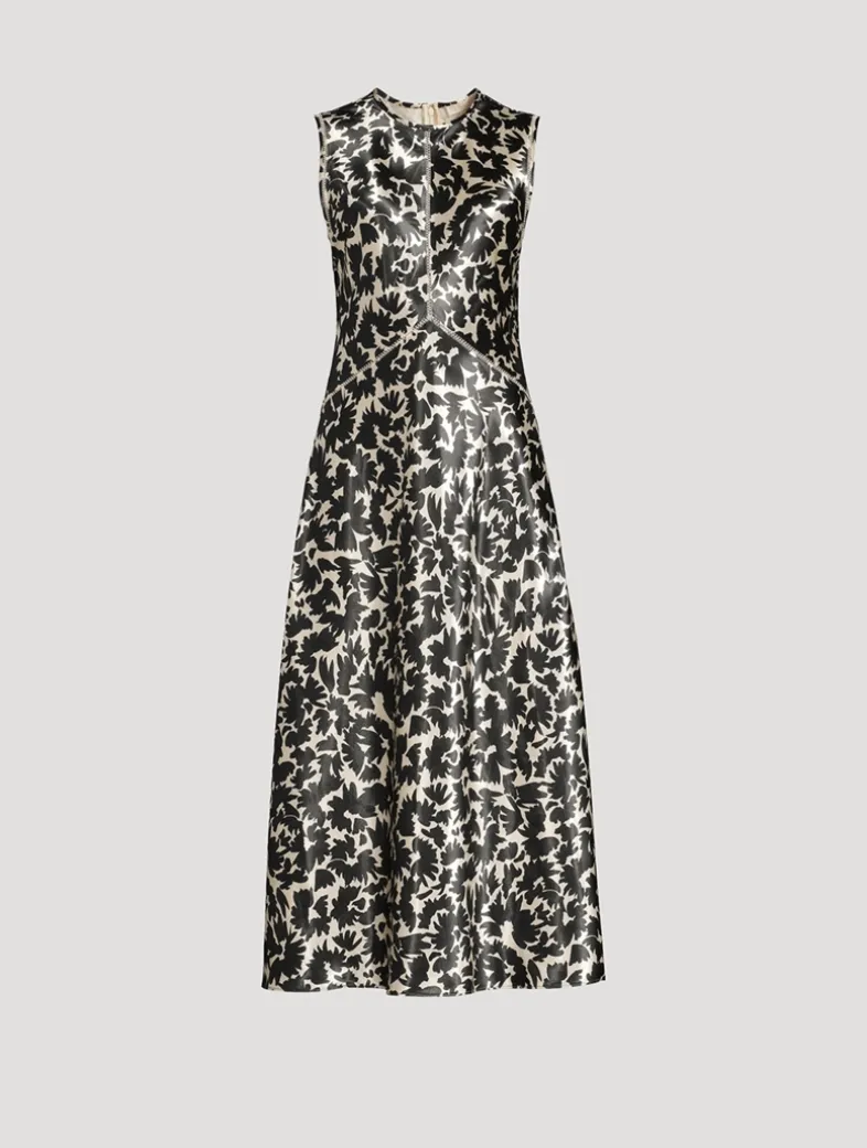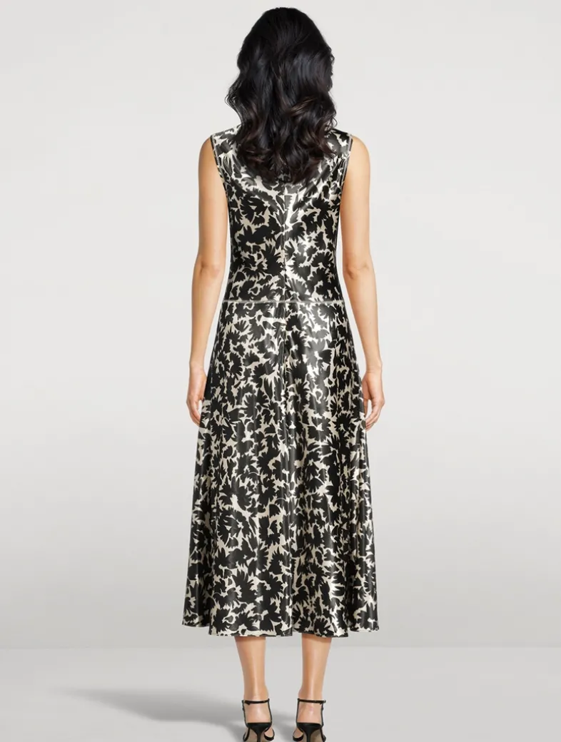The Lisbet Dress conjures a bold visual impact with striking botanicals printed atop ultra-lustrous satin. This lightweight, sleeveless midi dress is cut on the bias for a body-skimming fit and is finished with delicate ladder stitching. It fastens with a concealed back zipper.