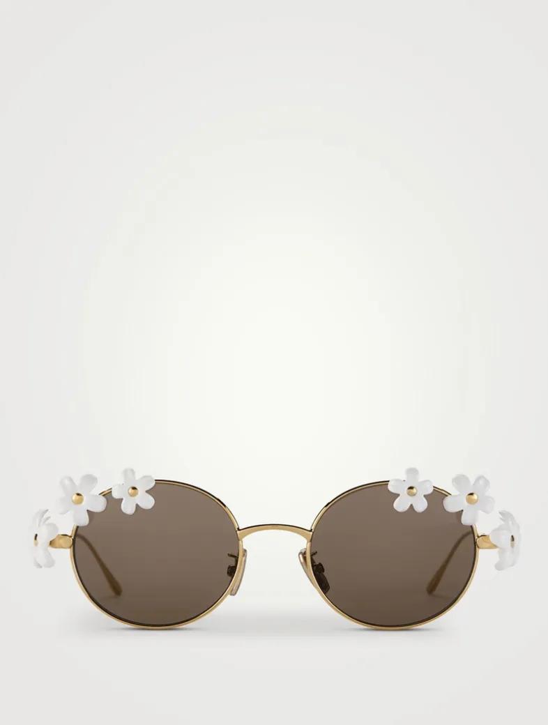 Made with a lightweight metal frame, these oval-shaped sunglasses are adorned with daisy embellishments along the top rim and temples.