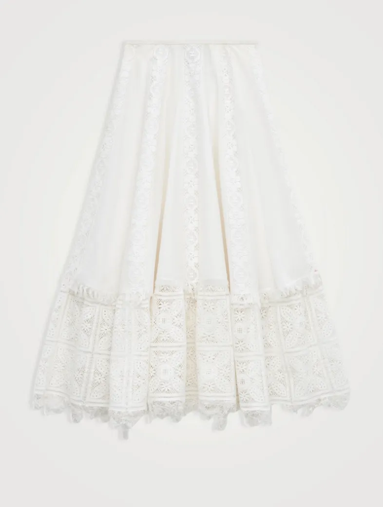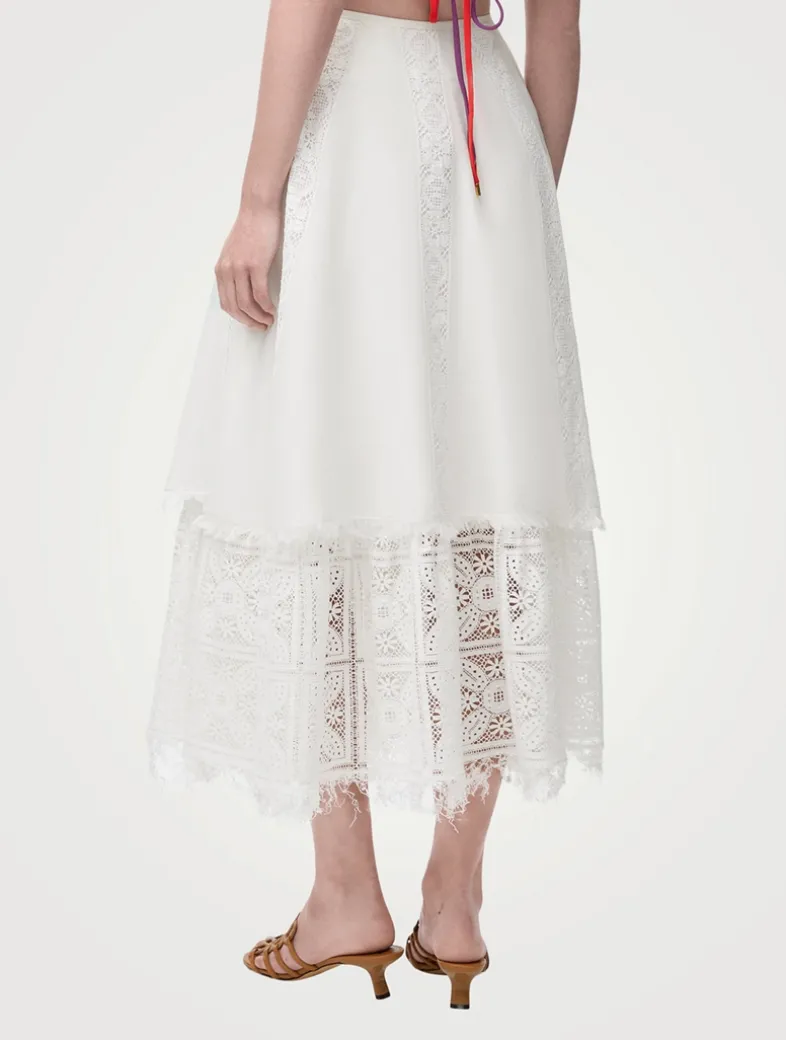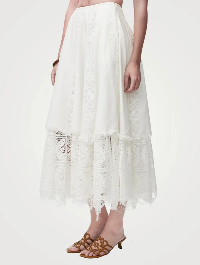 The latest LOEWE x Paula’s Ibiza collection explores the vibrant feeling of summer and is inspired by island freedom. Made in a lightweight blend of cotton and silk, this mid-rise midi skirt has lace inserts, a double layer construction, and a frayed hem.