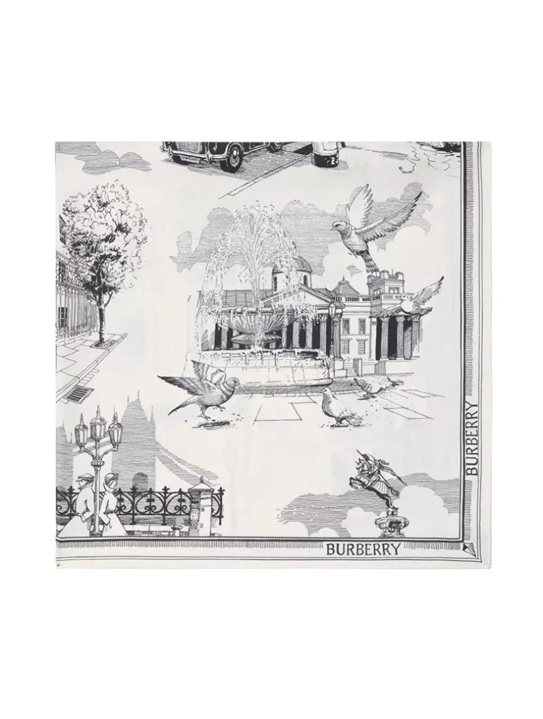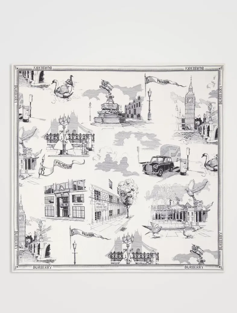 A scarf made in Italy from silk twill. The design is printed with hand-drawn artwork depicting iconic London landmarks including the Houses of Parliament, Tower Bridge, Trafalgar Square and our Horseferry House headquarters.