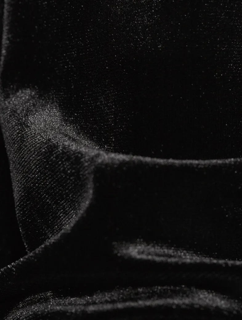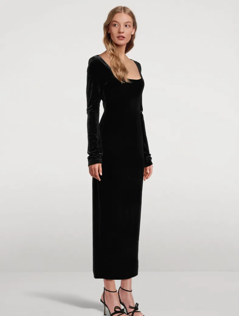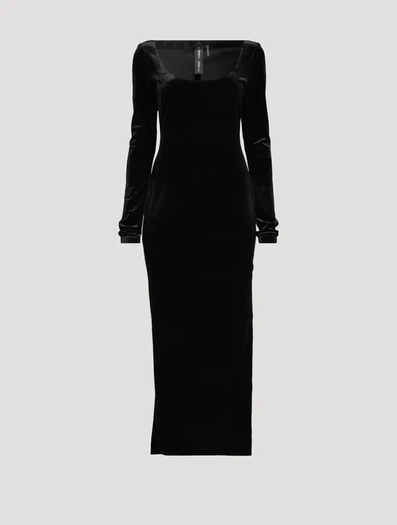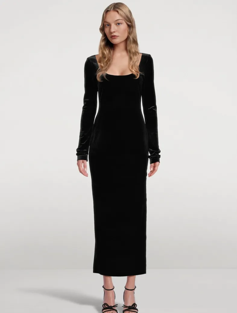 A four-ways stretch velvet construction lends a textured touch to this elegant dress. The bodice has a flattered scooped neckline framed by long sleeves, and it has an ankle-grazing skirt.