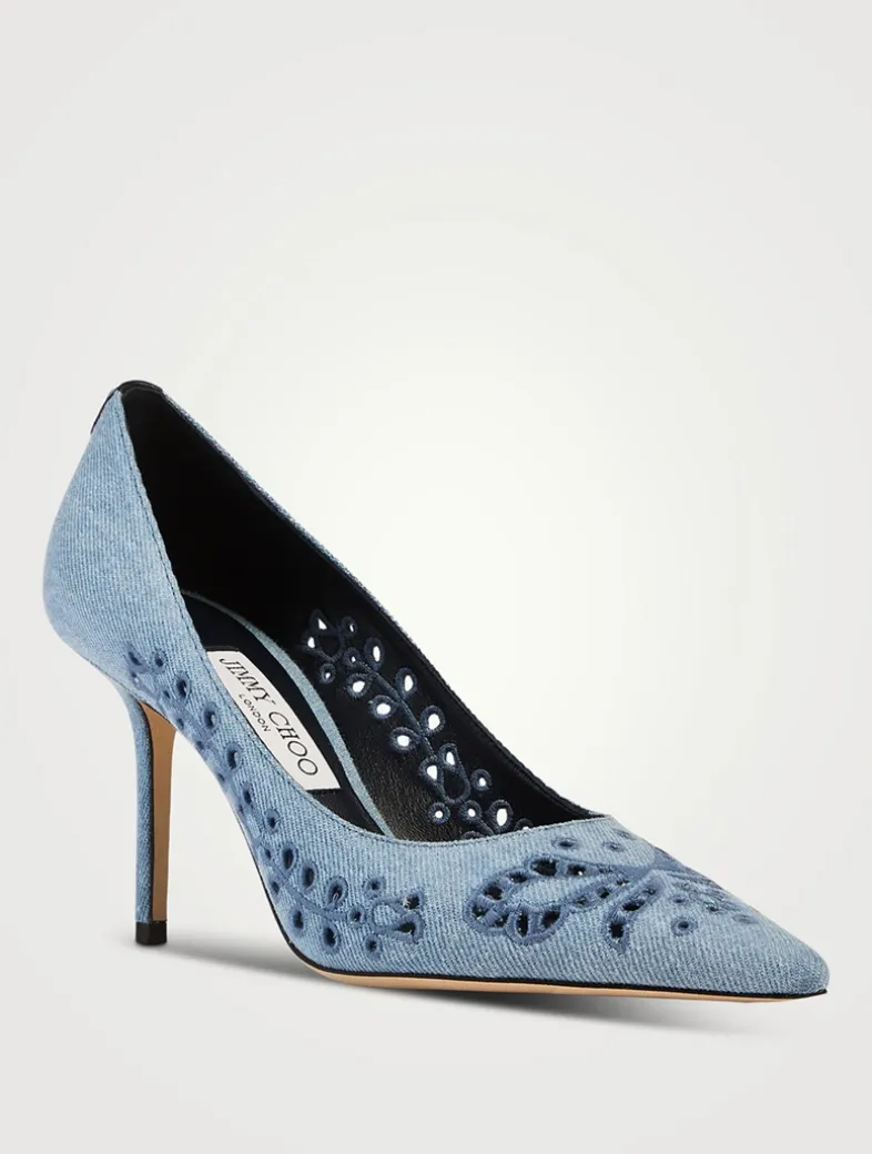 The iconic Jimmy Choo silhouette is updated with tonal Sangallo embroidery and dainty cut-outs. This pair, set on a slim 85mm heel, is designed with a dramatic pointed toe, and cut higher on the foot, allowing for more coverage.