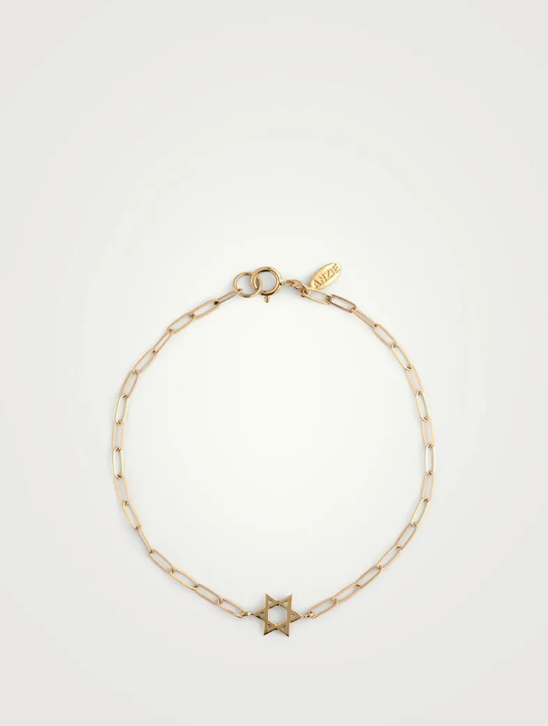 A solid gold Magen David adorns a modern paperclip chain. This 14k gold bracelet fastens with a spring ring clasp.