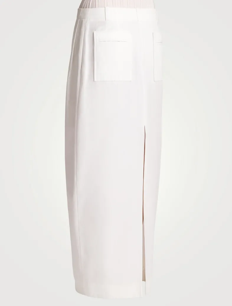 An elongated, pleat-front skirt in crisp poplin. It features a trouser-style waistband with zip fly and button, in-seam side pockets, welted patch pockets, and a back slit.