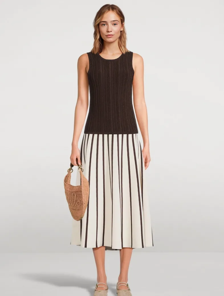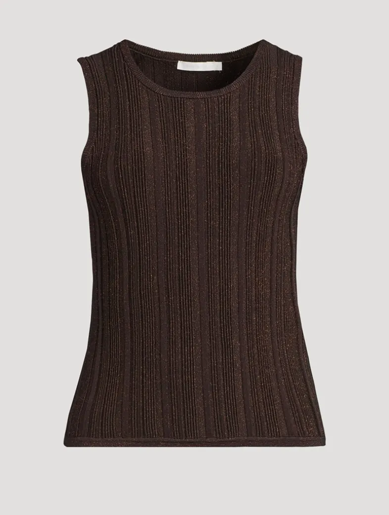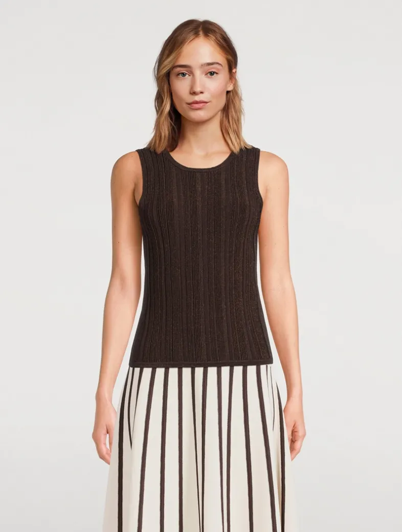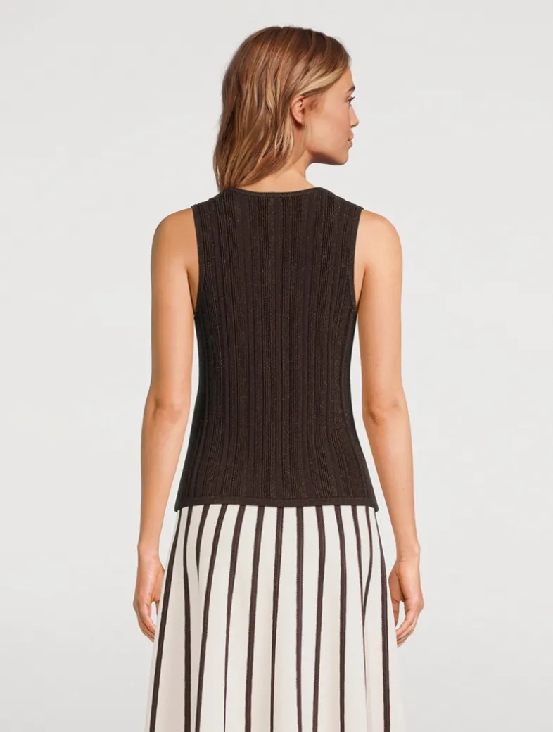 Cut to a curve-hugging silhouette and woven through with shimmering threads, this knit tank is designed with a high neckline at the front and back.