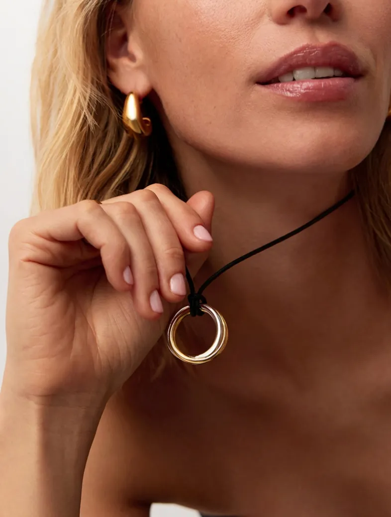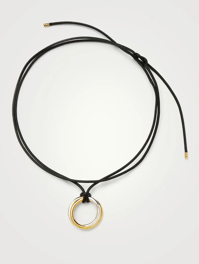A classic, reimagined. Inspired by the Lucy Williams Entwine Necklace, a mixed metal round pendant is combined with a long black cord necklace to create a distinctive finish. The cord can be tied at any length, doubled up as a choker, or worn long.