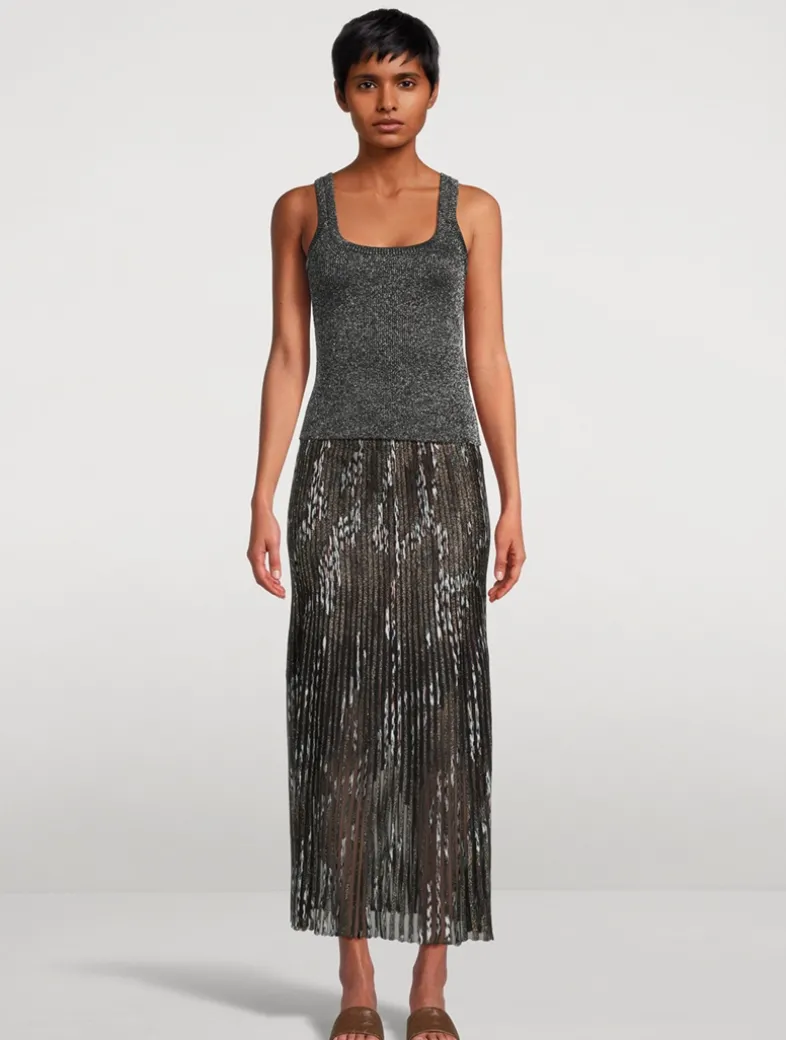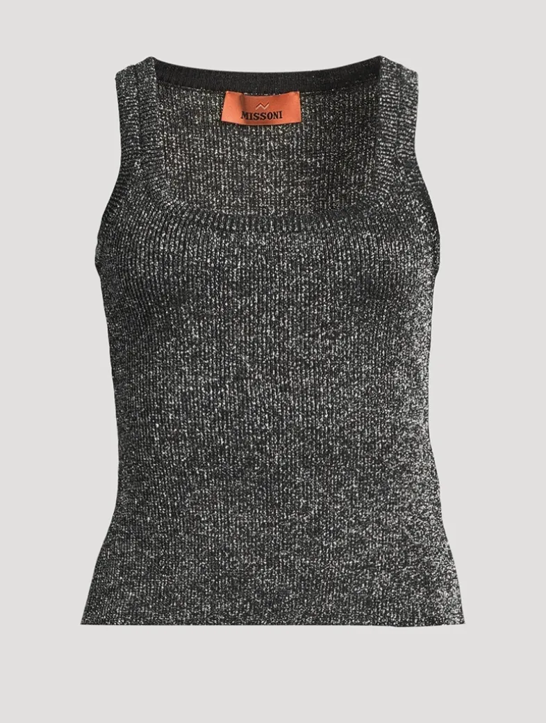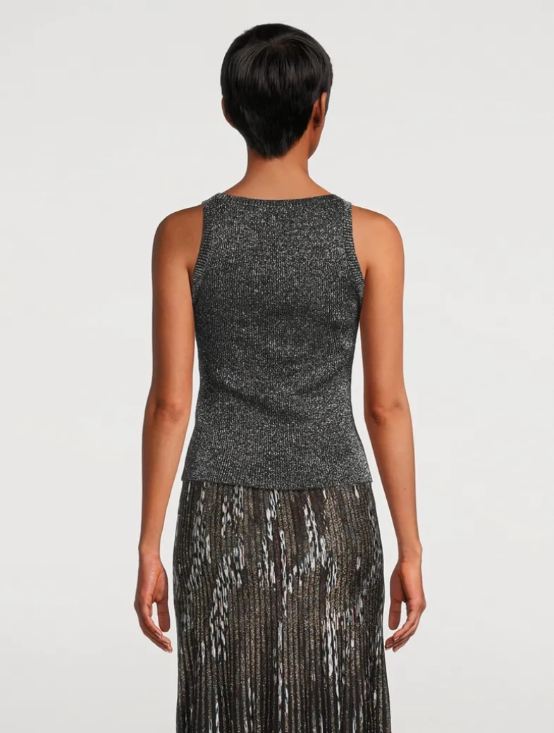 Minimalist yet refined, this tank is made from a viscose and lamé blend with fine vanisé workmanship. The square neckline enhances the clean lines of the garment, while the metallic reflections elevate its texture with subtle elegance.