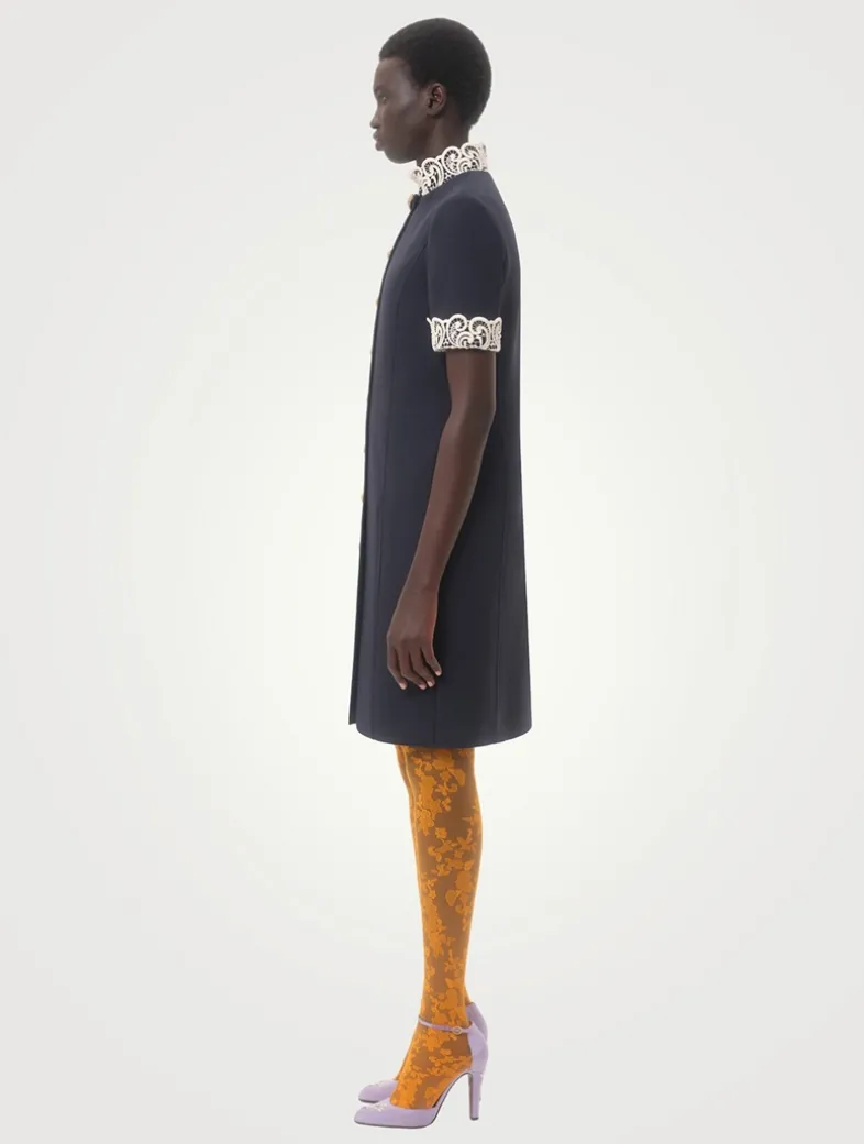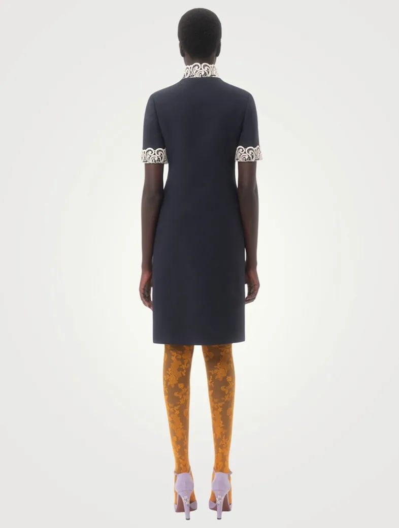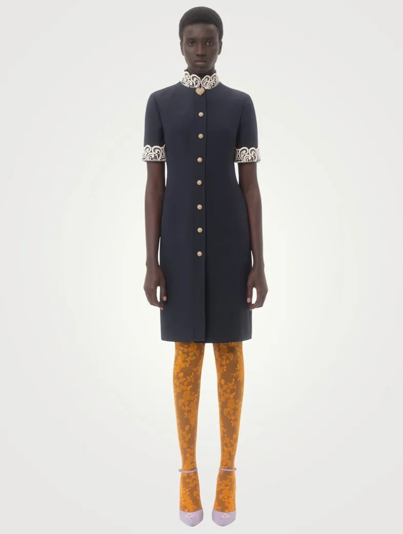This virgin wool and silk dress is embellished with delicate crochet trim around the collar and cuffs. It is dotted with crystal-encrusted buttons lining the front.