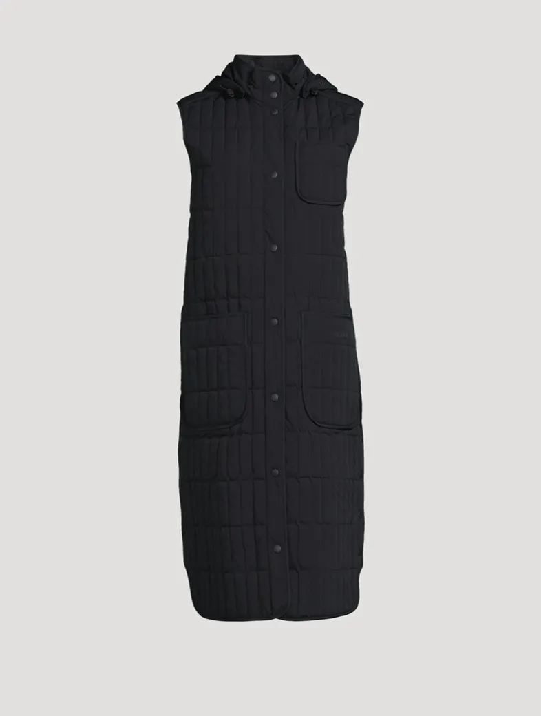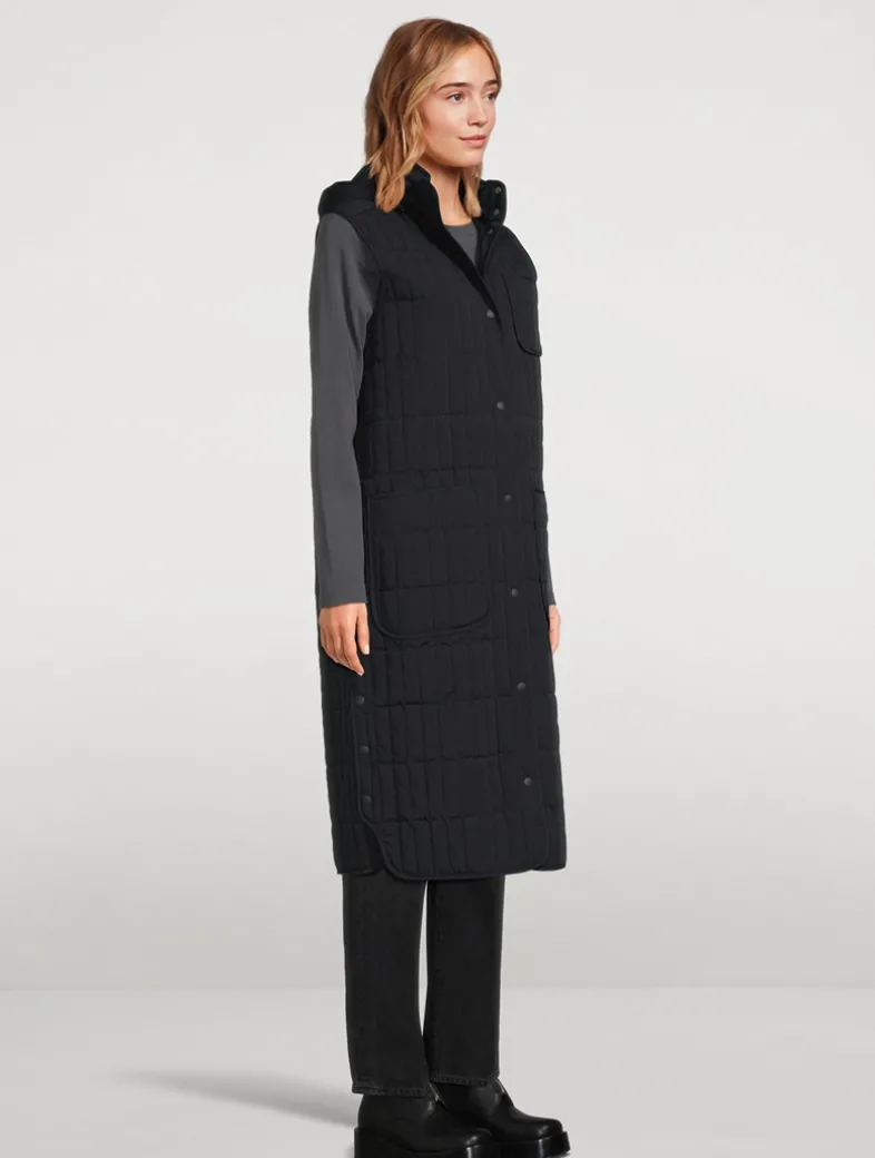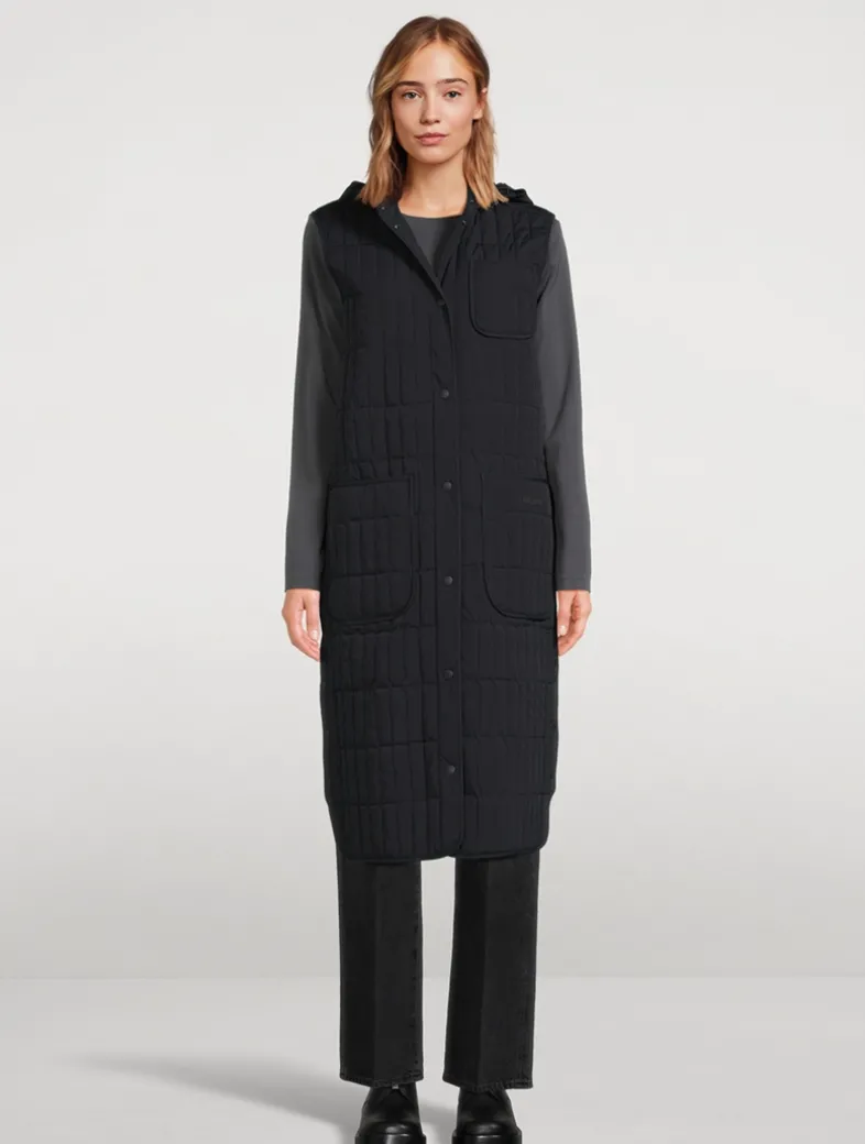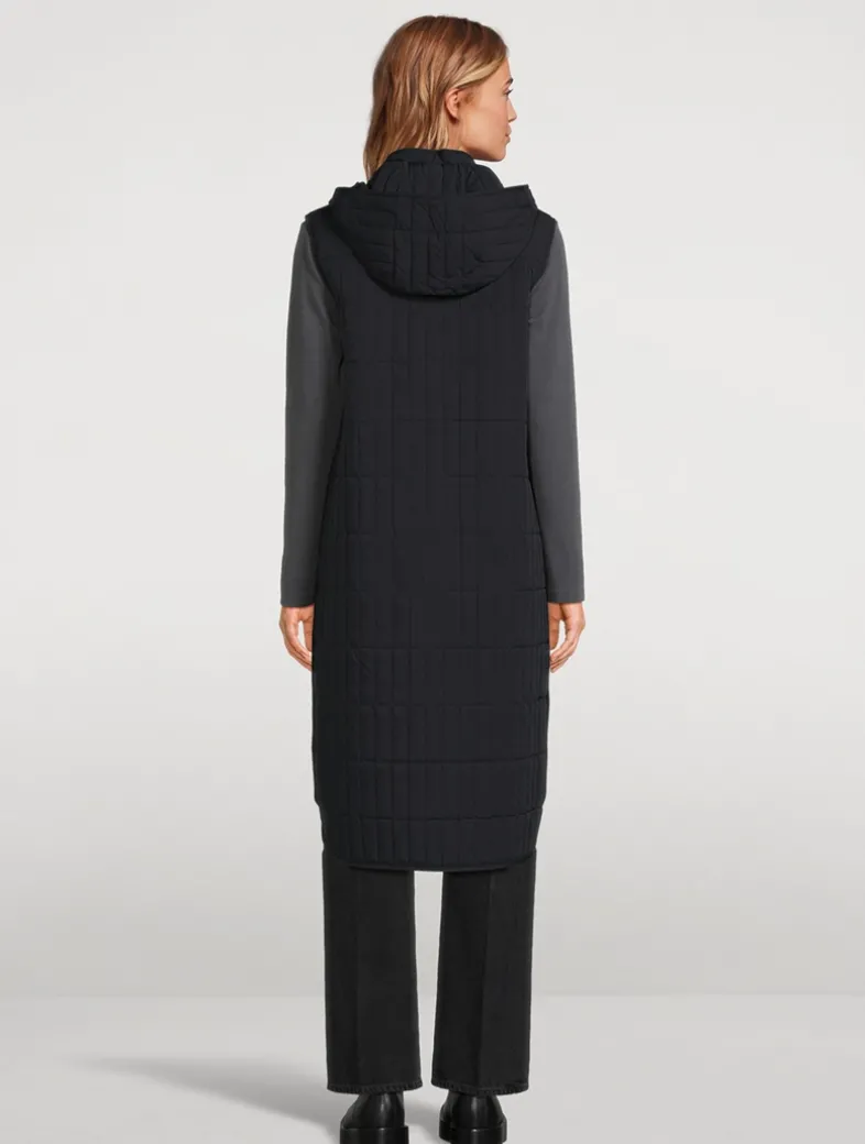 Makana is a semi-fitted long vest crafted from recycled nylon and filled with GRS certified recycled down, providing warmth in mild to cold climates. The vest features a stand collar with a removable hood and an adjustable bungee at the waist for a tailored silhouette. Patch pockets and a chest pocket provide practical features for day-to-day wear. Additional details include side vents with snaps for mobility and a center front snap closure for easy wear. The perfect transeasonal piece.