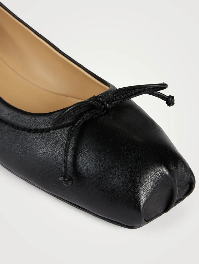 Flaunting a supple feel, these nappa leather ballet flats perfectly match the shape of the foot thanks to its sacchetto assembly. They are adorned at the front with a small bow whose curves contrast with its square toe. Enhanced with discreet topstitching, its low-cut upper delicately frames the foot.