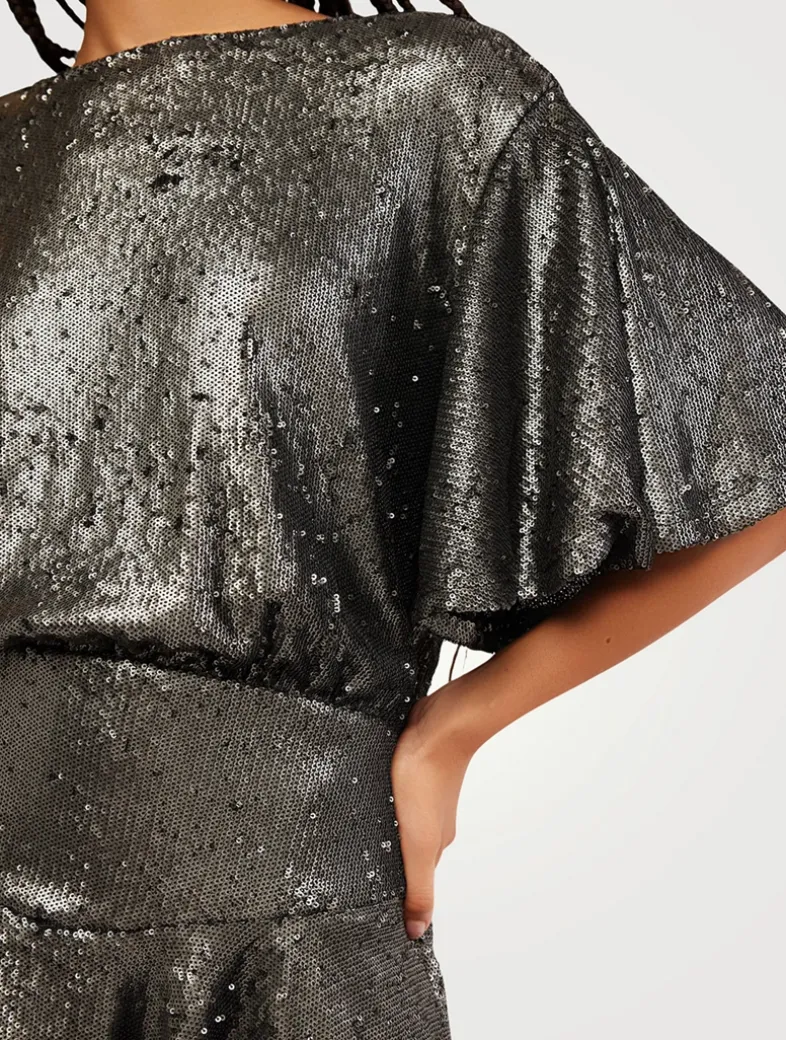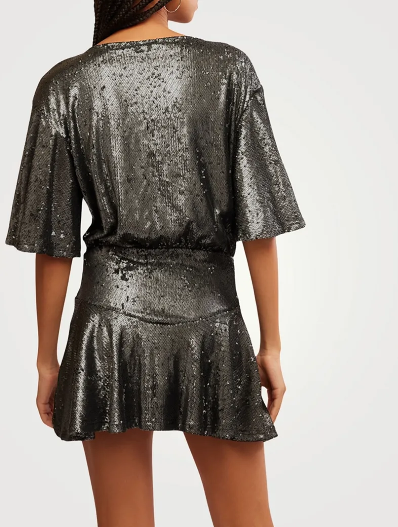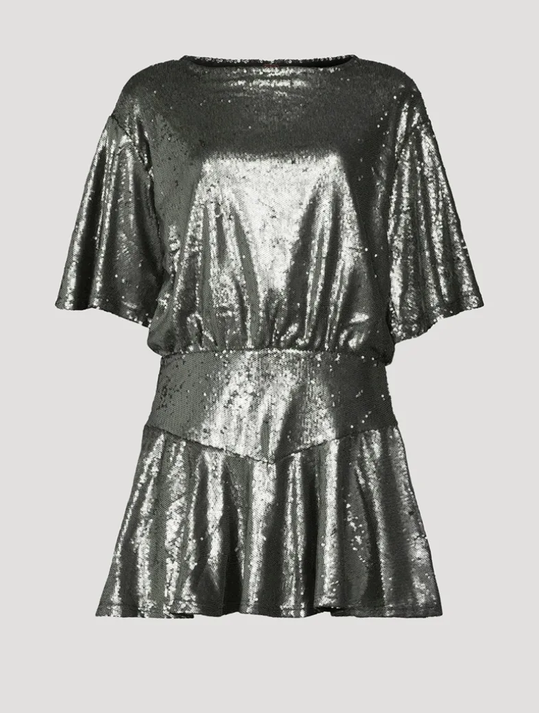Made to make a statement, this mini features a shimmery sequin fabrication and flattering drop-waist silhouette with a flowy skirt and short sleeves.