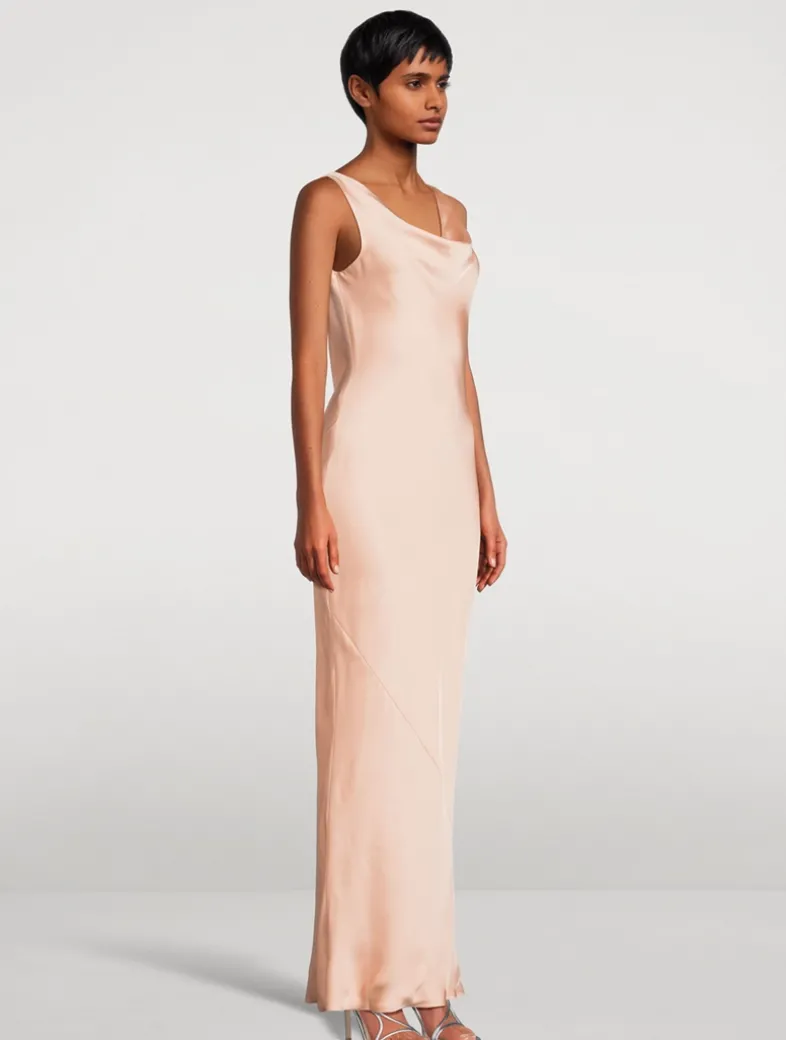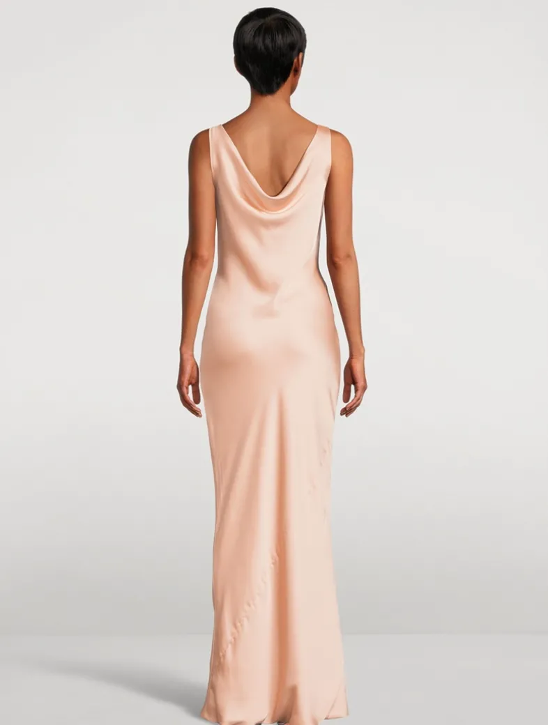 With a cowl neckline and draped back, this sleeveless dress is a classic. Cut on the bias, the silky satin fabric falls to a floor-grazing length for a beautiful evening look.