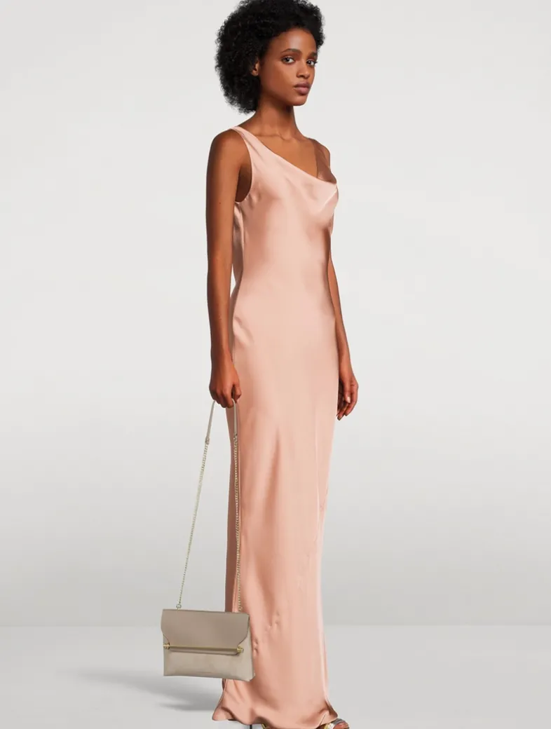 With a cowl neckline and back, this sleeveless dress is a classic. Cut on the bias, the silky satin fabric falls to a floor-grazing length for a beautiful evening look.