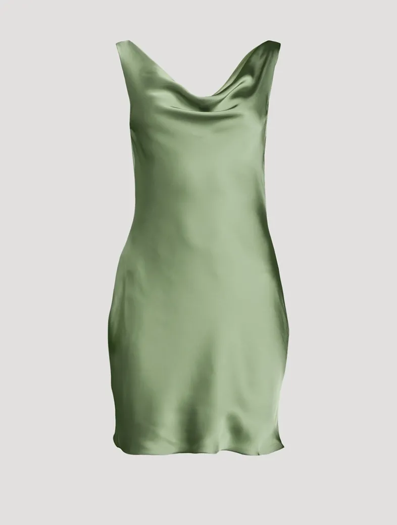 With a cowl neckline and back, this sleeveless dress is a classic. Cut on the bias, the silky satin fabric falls to a mini length for a sensual look.