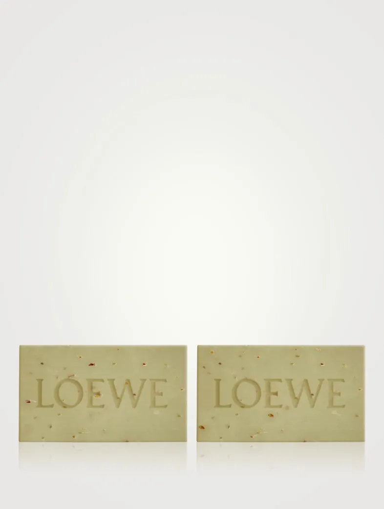A pair of cleansing bars featuring the LOEWE Home Scents Scent of Marihuana fragrance—a soothing aroma of the Sativa plant that leaves the skin feeling soft and refreshed. Inspired by the Ancient Greek and Roman practice of integrating therapeutic botanical essences in their bathing rituals, the soaps feature natural ingredients with skin-nourishing properties and actively hydrating elements including shea butter—a deeply moisturizing and soothing element.