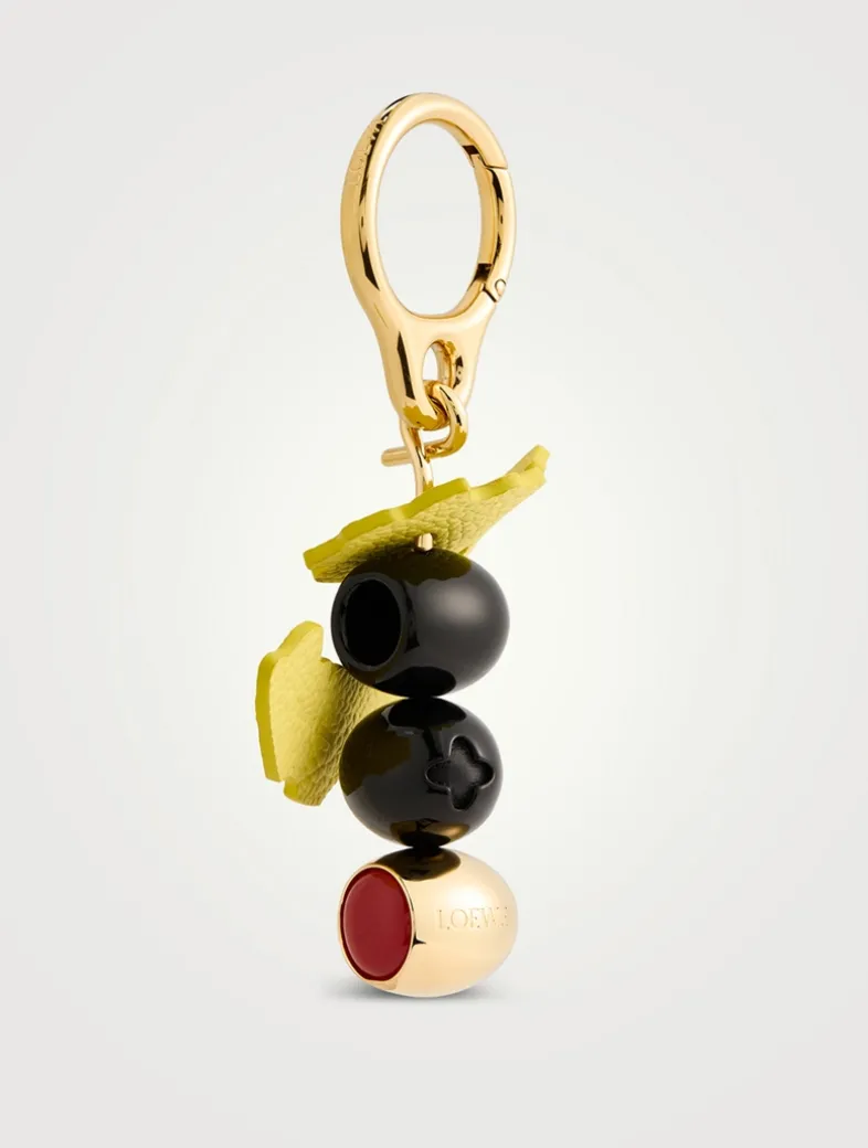 This playful bag charm in acetate and brass featuring a stacked olive design with a calfskin citrus peel. Finished with a dog clip fastening.