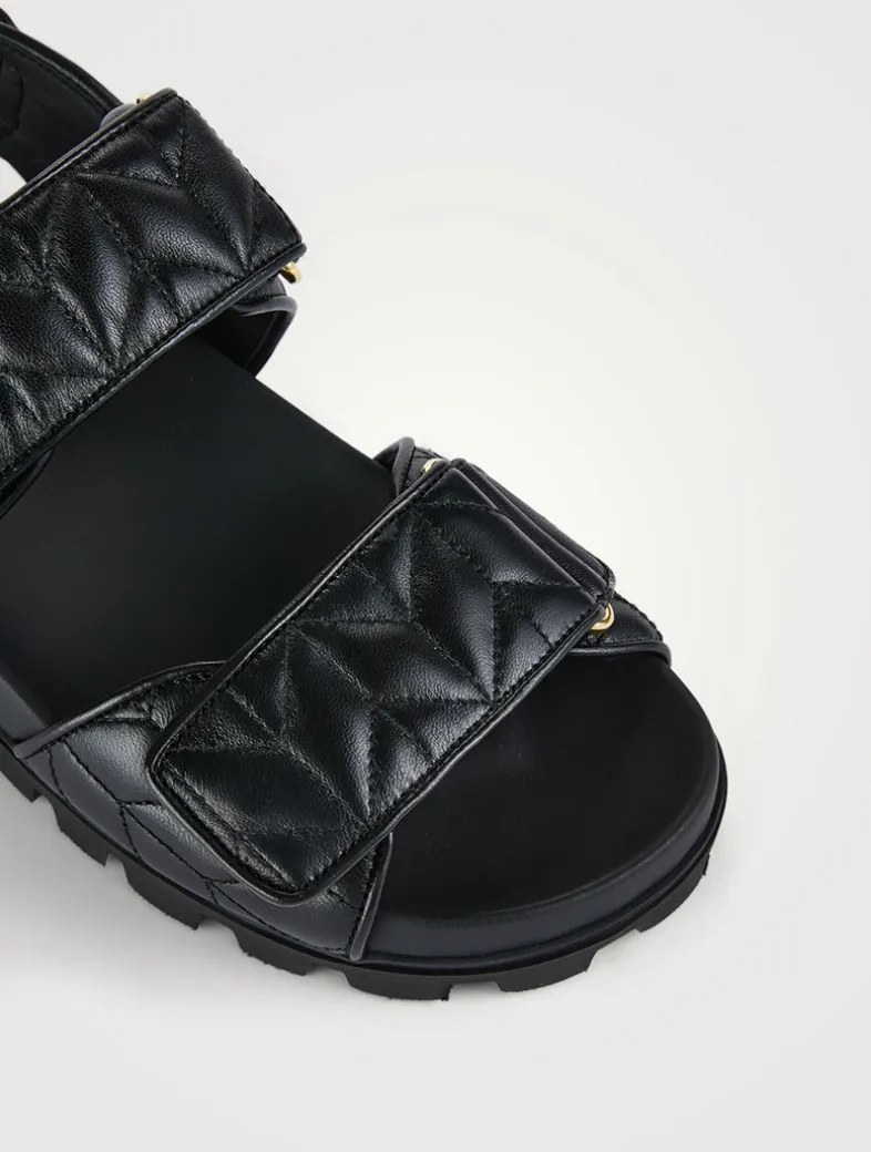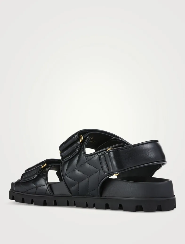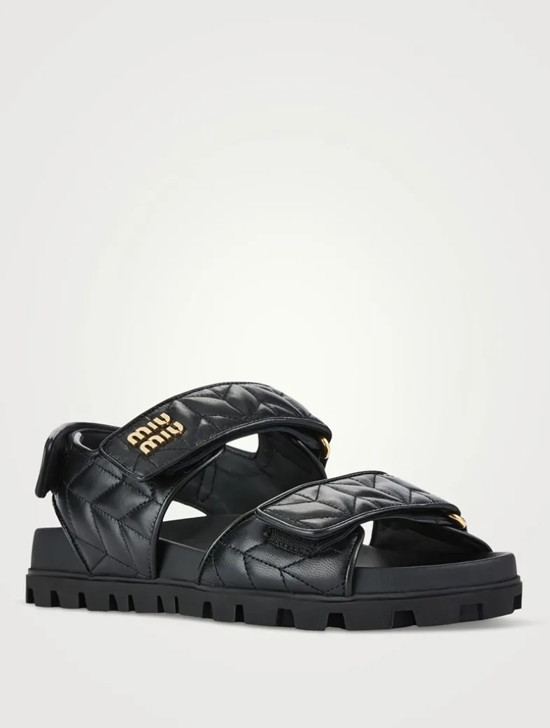 The sportswear world meets relaxed style and a captivating design in these quilted leather sandals. The metal Miu Miu logo, which stands out on one of the bands, completes the footwear with a distinctive note.