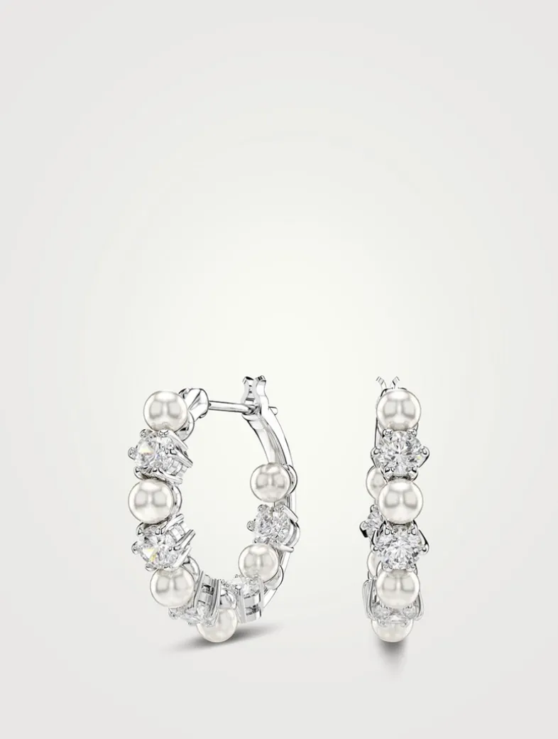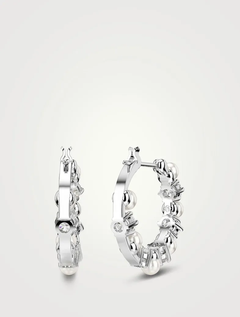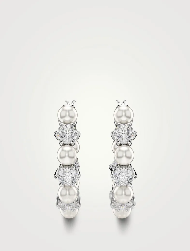 Each of these hoop earrings is rhodium plated and adorned with alternating Swarovski Zirconia and Swarovski Crystal Pearls.