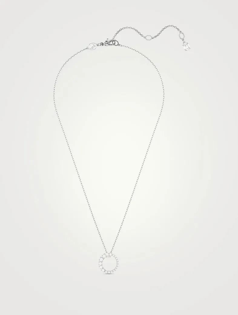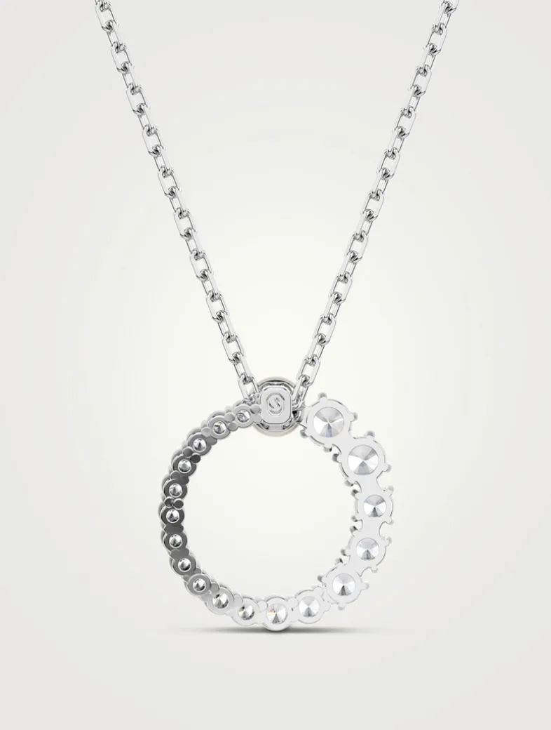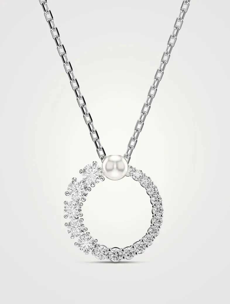 With its classic silhouette and contemporary detailing, this elegant Matrix pendant will attract attention. Suspended from a delicate chain, the rhodium plated piece features a ring of clear Swarovski Zirconia in different sizes, ranging from small to large, bookmarked with a white Swarovski Crystal Pearl at the centre. Swarovski Pearls have a crystal core that has an innovative coating on its surface, which makes it resistant to perspiration, sun, perfume, UV light, and scratches. The coating is extremely even and thick, unlike faux pearls, where the coating can be scratched or peeled off. Swarovski Pearls mimic genuine pearls in that they have similar weight, don’t scratch, and warm when in contact with skin.
