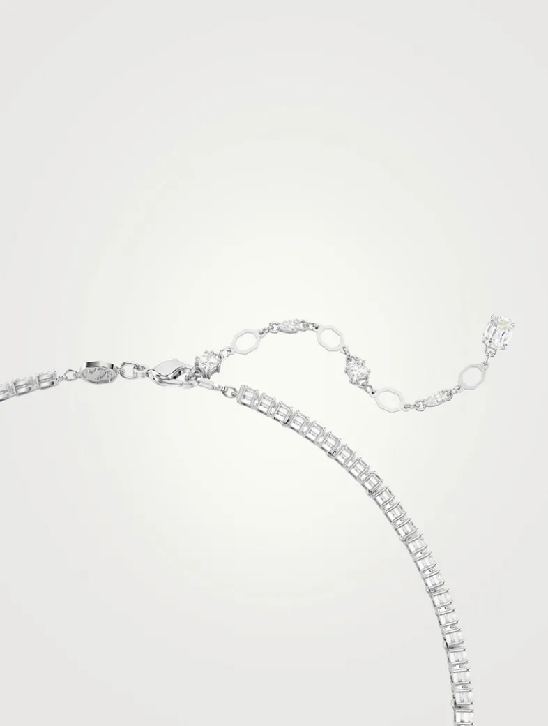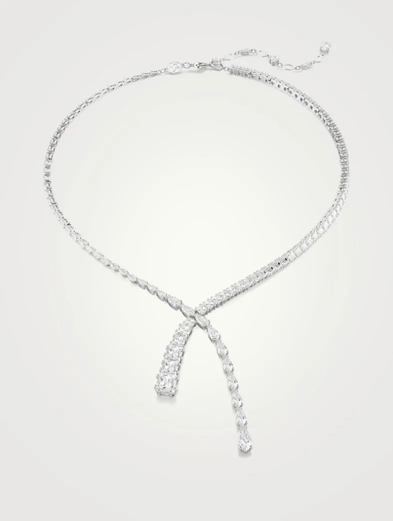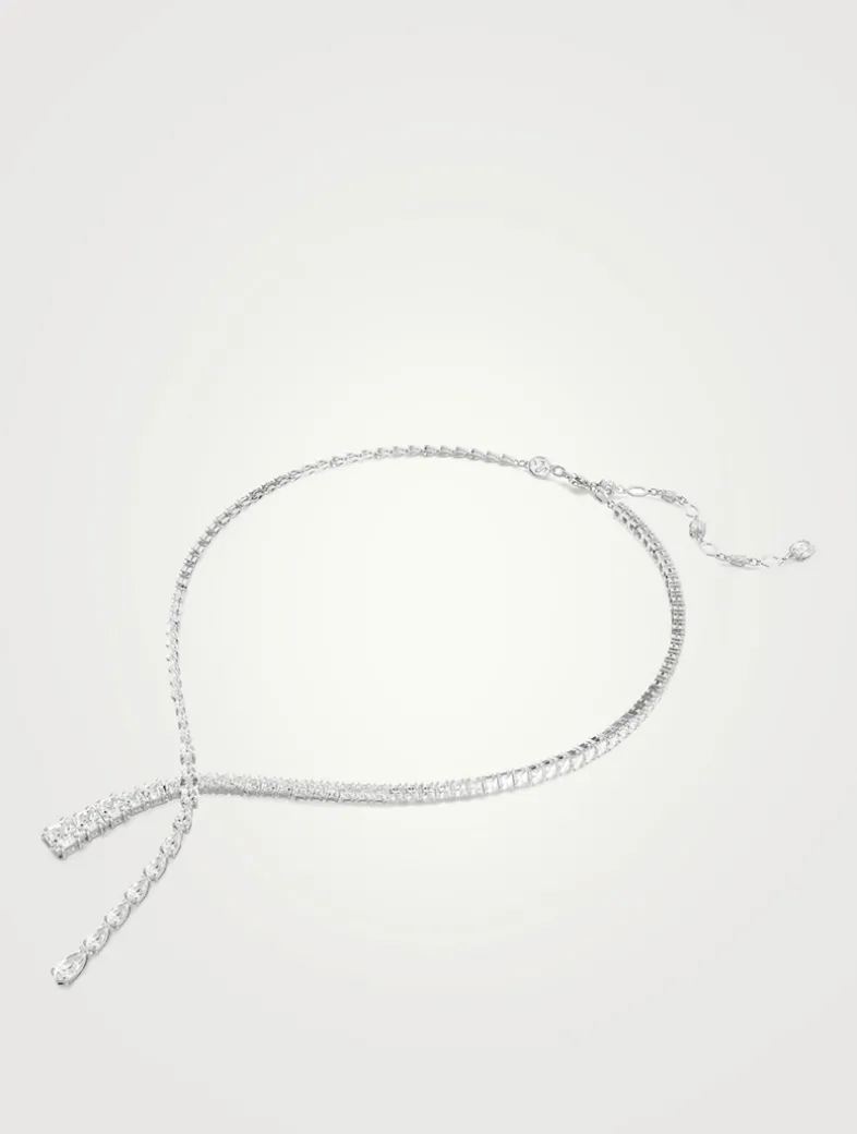 Refinement reigns in this delicate V-necklace. The rhodium plated design is adorned with an array of clear Swarovski Zirconia in pear and square cuts, with multiple sizes adding unexpected dimensions to the silhouette.