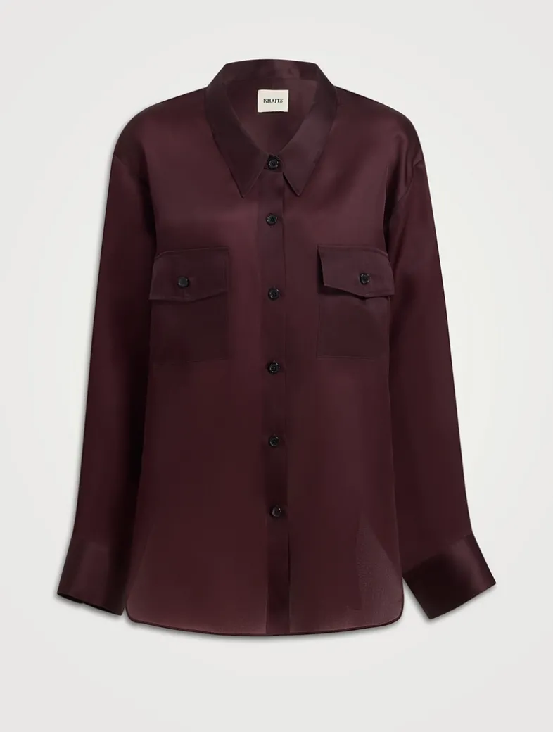 A relaxed, elegantly elongated button-up in compact organza—crisp and lightweight. Designed with dropped shoulder seams, back yoke, notched shirttail hem, and extended sleeves. Refined by patch pockets and horn buttons.