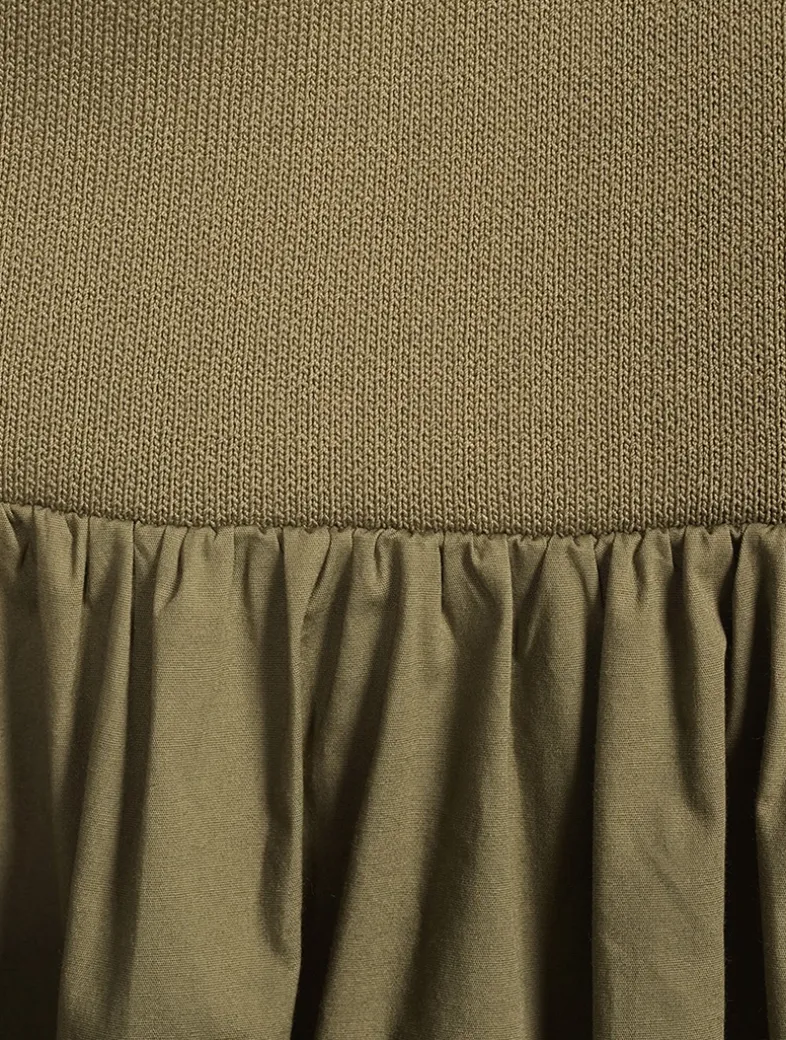 The Mavo dress showcases a modern mix of knit bustier at the top and crisp, gathered cotton-blend poplin skirt.