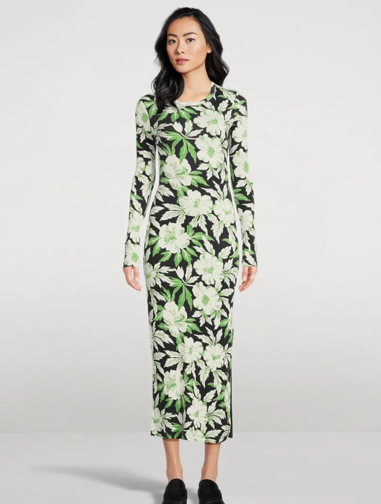 Crafted in a lightweight ribbed silk and cotton blend, this dress features an allover Hibiscus floral print. It is cut to a curve-hugging silhouette with a rounded neckline and long sleeves. Finished with Anagram embroidery placed at the back.