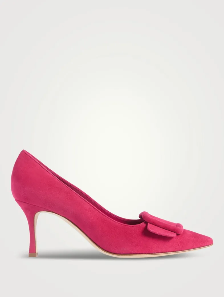 These Italian-crafted pointed-toe pumps in a soft suede are set on a covered mid-heel. The signature slip-on style features the iconic buckle that was first created in 1991 for Isaac Mizrahi’s catwalk collection.