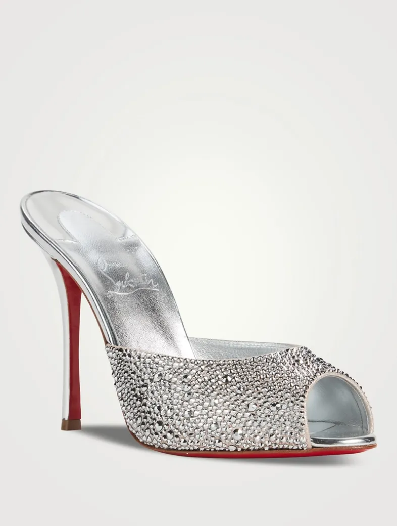 Inspired by Dolly Parton, the cute and retro Me Dolly mule has been reworked with a new heel height. A stunning model with a wide, almond-shaped peep-toe construction, and LOUBOUTIN’s signature 100mm ‘fetish’ heel. Meticulously crafted in suede embellished with tonal strass, which is further enhanced by a specchio-effect heel.