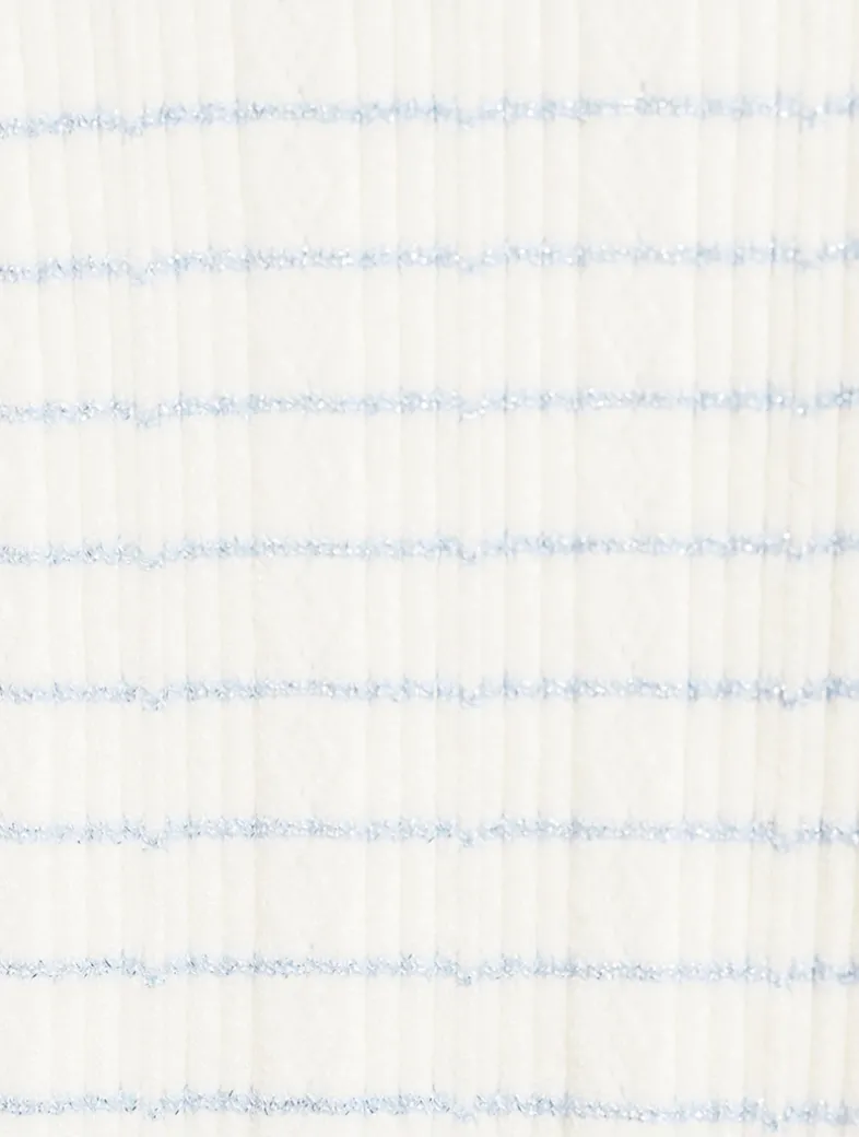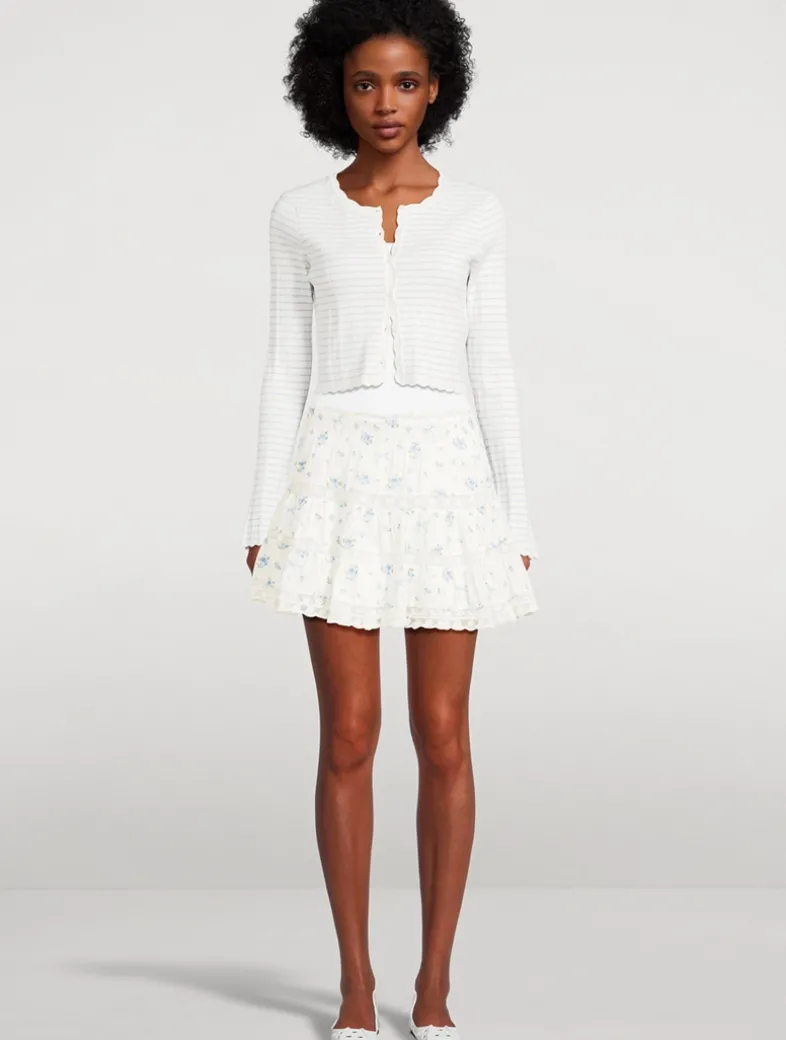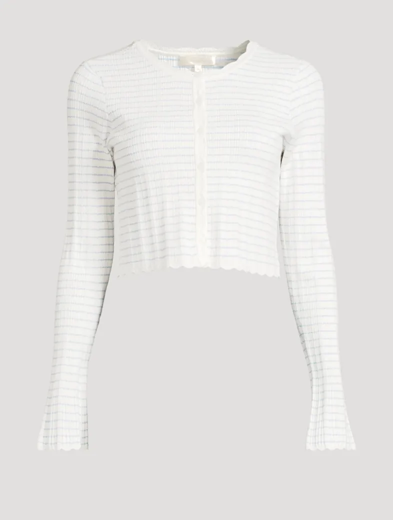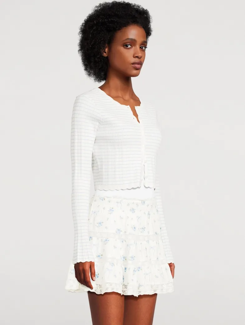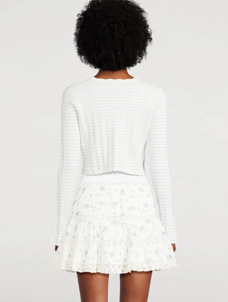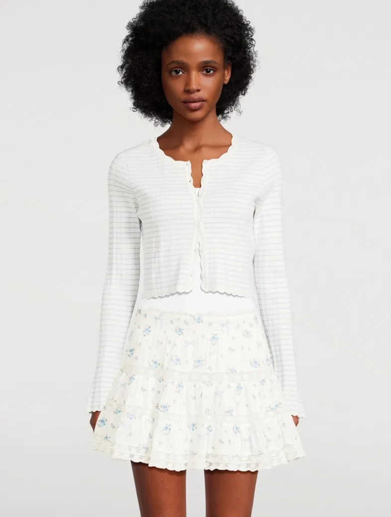 A lightweight and airy layer, this cardigan is made from soft, stretchy pointelle yarn with an all-over rib pattern featuring delicate lurex stripes for a subtle, signature shimmer. With a tiny scallop detail through the stitch and the edge, the sweater includes long sleeves with a playful flair at the cuffs and custom shell LoveShackFancy bow buttons.