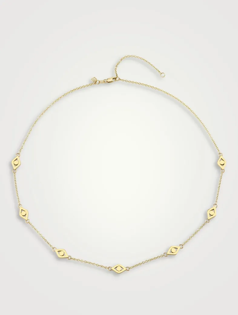 This adjustable chain necklace features Sydney Evan’s iconic evil eye charm repeated in 14k gold.