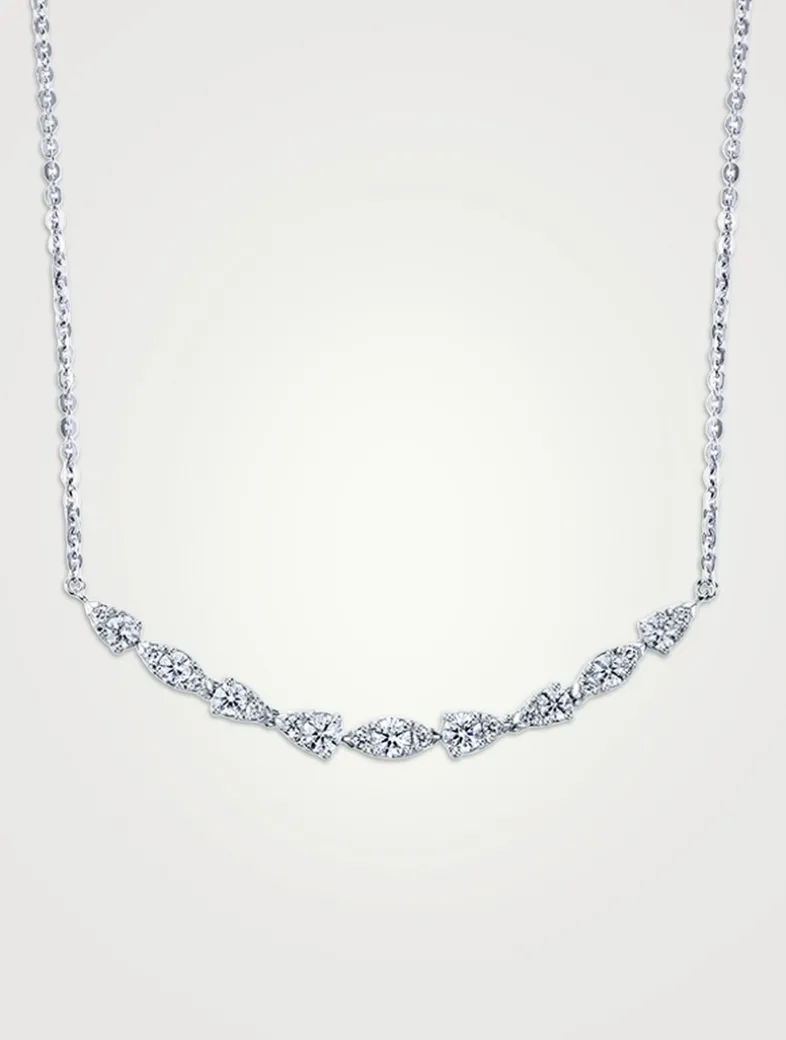 Sparkling diamonds are set into marquise and pear-shaped elements which decorate a thin gold chain.